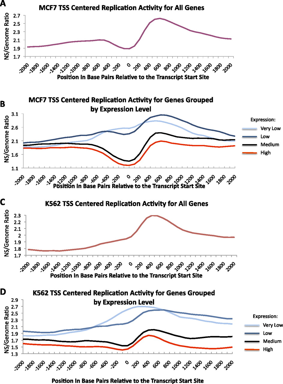 Replication initiation depletion at the transcription start site (TSS) in transcribed genes. (A) Average replication enrichment ratio in MCF7 cells (calculated as in Fig. 2) plotted against distance from the TSS for all known genes. (B) Distribution of replication enrichment ratios in MCF7 cells for groups of genes that exhibit different levels of expression. Levels include the following: very low (log2 GCRMA <2.3), low (log2 GCRMA 2.3–5.3), medium (log2 GCRMA 5.3–8.5), and high (log2 GCRMA >8.5). (C,D) The same analyses are shown for K562 cells.