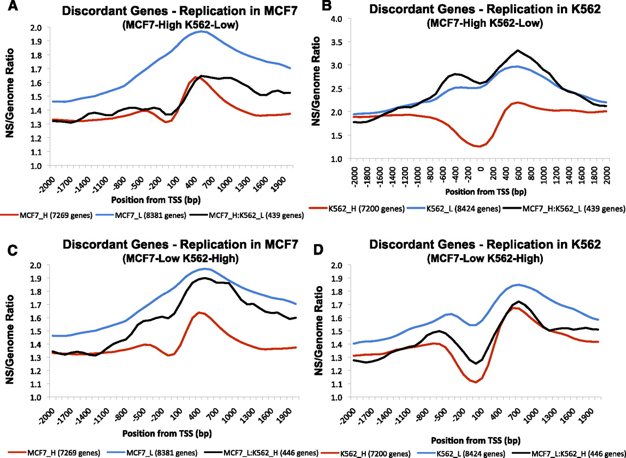Replication initiation in discordantly expressed genes. We calculated replication enrichment ratios (nascent strands RPKM vs. control genomic DNA RPKM) for genes whose level of expression differed significantly between K562 and MCF7 cell types. Genes with log2 GCRMA values <4.3 in MCF7 and >6.3 in K562 were considered MCF7-low and K562-high (MCF7_L:K562_H); genes with log2 GCRMA values <4.3 in K562 and >6.3 in MCF7 were considered MCF7-high and K562-low (MCF7_H:K562_L). (A) Distribution of nascent strand enrichment ratios in MCF7 cells for MCF7_H:K562_L genes. For comparison, enrichment ratio plots for MCF7_H and MCF7_L genes are shown. (B) Distribution of enrichment ratios in K562 cells for MCF7_H:K562_L genes. For comparison, enrichment ratio plots for K562_H and K562_L genes are shown. (C) Distribution of nascent strand enrichment ratios in MCF7 cells for MCF7_L:K562_H genes. For comparison, enrichment ratio plots for MCF7_H and MCF7_L genes are shown. (D) Distribution of enrichment ratios in K562 cells for MCF7_L:K562_H genes. For comparison, enrichment ratio plots for K562_H and K562_L genes are shown.