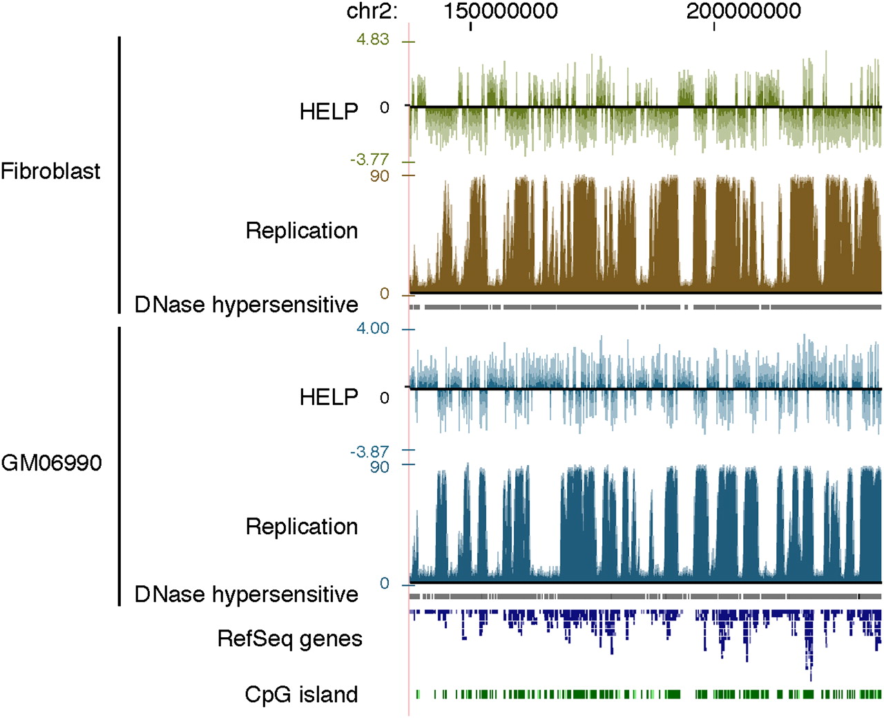 Cytosine methylation and replication timing correlate in broad genomic regions. (Top) Fibroblast data; (bottom) GM06690 lymphoblastoid cell line data. Cytosine methylation is shown as the HpaII/MspI log2 intensity ratio from the HELP assay. Positive values indicate relative hypomethylation, and negative values indicate hypermethylation of HpaII sites. DNA replication timing data are generated from raw sequence reads by an arctangent transformation of 1-kb counts comparing early (G1 and S1) and late (S4 and G2) cell samples, as described in the Methods section. Earlier replicated regions have higher values than later replicated regions.