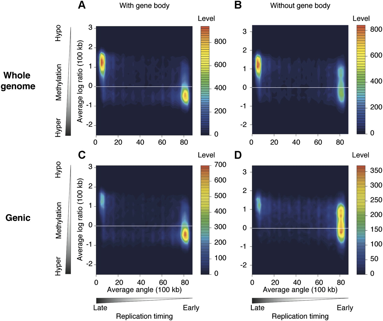 The hypermethylation of early-replicating regions is predominantly due to gene-body hypermethylation. We tested how gene-body methylation could be contributing to the patterns shown in Figure 2, reproducing the fibroblast plot to facilitate comparison in A. C shows the results when 100-kb windows that do not contain genes are removed, with a decrease in the late-replicating/hypomethylated population of signals. Excluding gene bodies, to study only intergenic methylation, generates a shift in signal distribution toward hypomethylated DNA (B), especially when the analysis is restricted to the gene-containing regions of the genome (D). These results show that a substantial proportion of the correlation of cytosine methylation with early replication is due to the methylation targeting transcribed sequences.