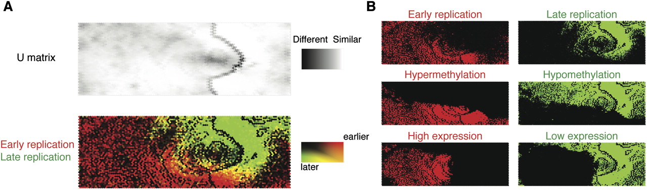 A self-organizing map analysis correlates DNA replication with methylation and transcription patterns. In this self-organizing map (SOM) representation of the multivariate data set, the top panel shows a U matrix representation of the map derived from genome-wide DNA methylation log2 ratios, RefSeq gene expression, RefSeq gene number, CpG island number, and HpaII-amplifiable fragment number in each 100-kb window. Each node is shaded using a linear grayscale that represents the mean Euclidean distance of that node vector relative to its immediate neighbors on the map ([white] most similar; [black] least similar). Overlaying loci with information about late (green) and early (red) replication shows that the parameters tested are predictive of replication timing, as evidenced by the clear separation of the red and green regions (A). We break out some of the variables used in generating the SOM (cytosine methylation, gene expression) to illustrate their overall correlations with DNA replication (B).