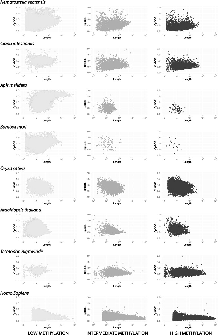 Relationship among gene-body CpGo/e, average gene-body DNA methylation levels, and gene length. The average methylation value for each gene was obtained by averaging the methylation values over all CpG sites (for which data were available) contained within the gene-body. Raw BS-seq data are from Cokus et al. (2008), Zemach et al. (2010), and Lister et al. (2009).
