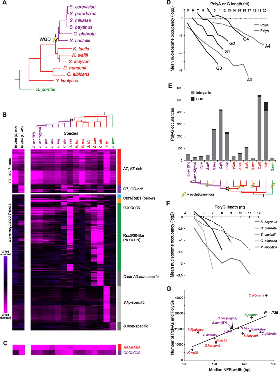 PolyG is an instrinsic antinucleosomal sequence element. (A) Phylogeny of species included in this study (adapted from Wapinski et al. 2007). Whole-genome duplication (WGD) event is marked by the yellow star. Species names are colored to denote major phylogenetic groups. (B) Nucleosome occupancy over 7-mers. All 7-mer sequences (rows) with mean log2 occupancy <−0.75 (there are no 7-mers with occupancy >0.75) in at least one species (columns) are shown across all species for in vivo data (righthand 14 columns) (Tsankov et al. 2010; Weiner et al. 2010) and for in vitro reconstitution experiments (lefthand two columns) (Kaplan et al. 2008; Field et al. 2009). Sequences are clustered by their nucleosome occupancy profiles and specific clusters are marked on right. (Pink) depleted; (violet) occupied. (C) Data for 7-mers AAAAAAA and GGGGGGG, as in B. (D) poly(G) sequences affect nucleosome depletion in vitro in a similar manner to poly(A) sequences. Shown is the average log2 nucleosome occupancy (y-axis) from in vitro reconstitution of C. albicans genomic DNA (Field et al. 2009) for poly(A) and poly(G) sequences of various lengths (x-axis). Ai (Gi) refers to poly(A) [poly(G)] sequences with i mismatches (e.g., A0, no mismatches; A4, four mismatches). (E) Abundance and locations of poly(G) sequences in each species. (Top) Shown are values for sequences of strength 4 or greater (see Methods). (Gray) Positioned within intergenic region; (black) positioned within coding sequence (CDS). (Bottom) A phylogenetic reconstruction of evolutionary losses (lightning bolt) of abundance in poly(G) sequences along the phylogeny. (F) poly(G) elements are also nucleosome depleted in vivo in several yeast species. Shown are the mean in vivo log2 nucleosome occupancies (y-axis) for poly(G) sequences (no mismatches) of different lengths (x-axis) in several species. (G) Median NFR width in each species correlates with abundance of antinucleosomal tracts in its genome. Shown is the median NFR width (Tsankov et al. 2010) (x-axis) for each species (♦) vs. the total number of poly(A) and poly(G) sequences of strength 2 or greater in that species (y-axis). Line represents the best linear fit. Species names are colored as in A.