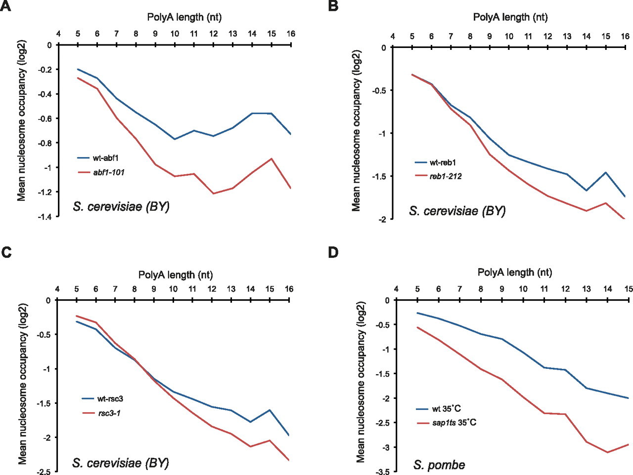 GRF deletion affects occupancy at intrinsic poly(A) sequences in S. cerevisiae and S. pombe. Shown are mean nucleosome occupancy levels (log2, y-axis) for poly(A) sequences of different length (x-axis) in wild-type cells (blue) and in red: (A) abf1-101 strain in S. cerevisiae; (B) reb1-212 strain in S. cerevisiae; (C) rsc3-1 strain in S. cerevisiae; and (D) sap1ts strain at restrictive temperature (35°C) in S. pombe.