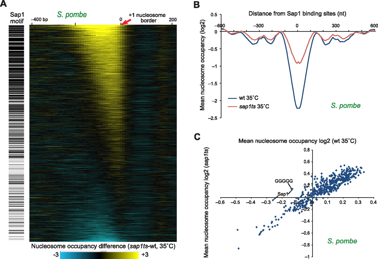 Sap1 acts as a GRF in S. pombe. (A) Sap1 deletion in S. pombe results in increased nucleosome occupancy at Sap1 motifs. (Left) Genes with significant matches to the Sap1 binding half-site (black). (Right) Difference in nucleosome abundance at each gene in S. pombe (rows) between sap1ts and wild-type strains (both at restrictive temperatures). Genes are aligned by the +1 nucleosome/NFR boundary (0, red arrow) and ranked from gain (top, yellow) to loss (bottom, blue) in nucleosome occupancy over their NFR. (B) Increased nucleosome occupancy at Sap1 half-sites in a sap1ts strain in S. pombe. Shown are log2 nucleosome occupancy averages at all genes with a significant Sap1 motif match in their upstream promoter for a sap1ts strain (red) and a wild-type strain (blue) grown in restrictive temperatures (35°C). Genes are aligned by the location of the Sap1 motif. Nucleosome occupancy increases over Sap1 sites is characteristic of GRF activity. (C) Increased nucleosome occupancy in 5-mers, reflecting the Sap1 half-sites in a sap1ts strain compared with wild-type (both at restrictive temperature, 35°C). Shown is the mean nucleosome occupancy (log2) for each 5-mer in the wild-type (x-axis) and the sap1ts strain (y-axis). Sap1 half-sites are labeled. The only additional site with increased occupancy is the intrinsic sequence GGGGG.