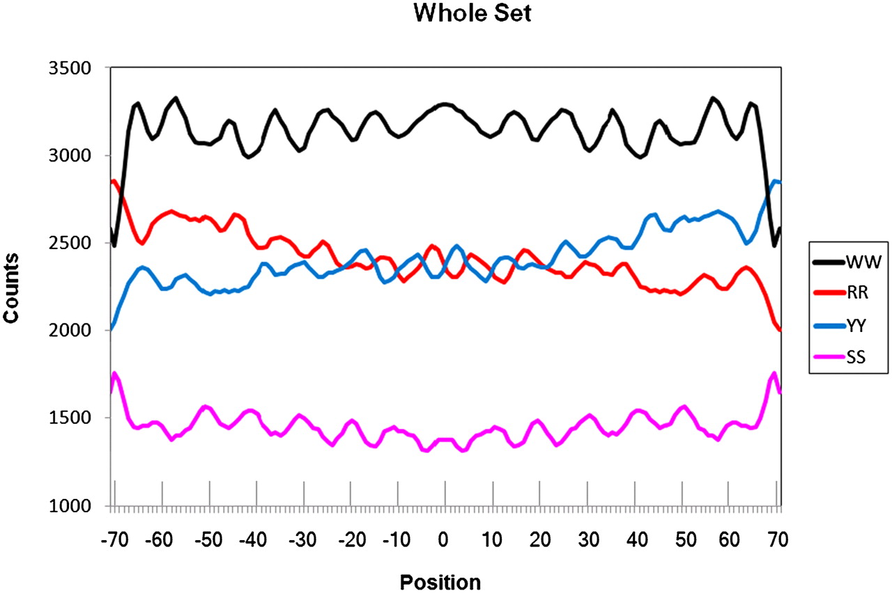 Counts for combined dinucleotide distributions (smoothed by 3-points sliding average) for the well-phased H2A.Z nucleosomes used as a training set (according to Albert et al. 2007). Positions are for the aligned nucleosome DNA sequences. Position 0 coincides with the dyad symmetry of the nucleosome. Normalized frequency distributions can be found in Supplemental Figure 2.