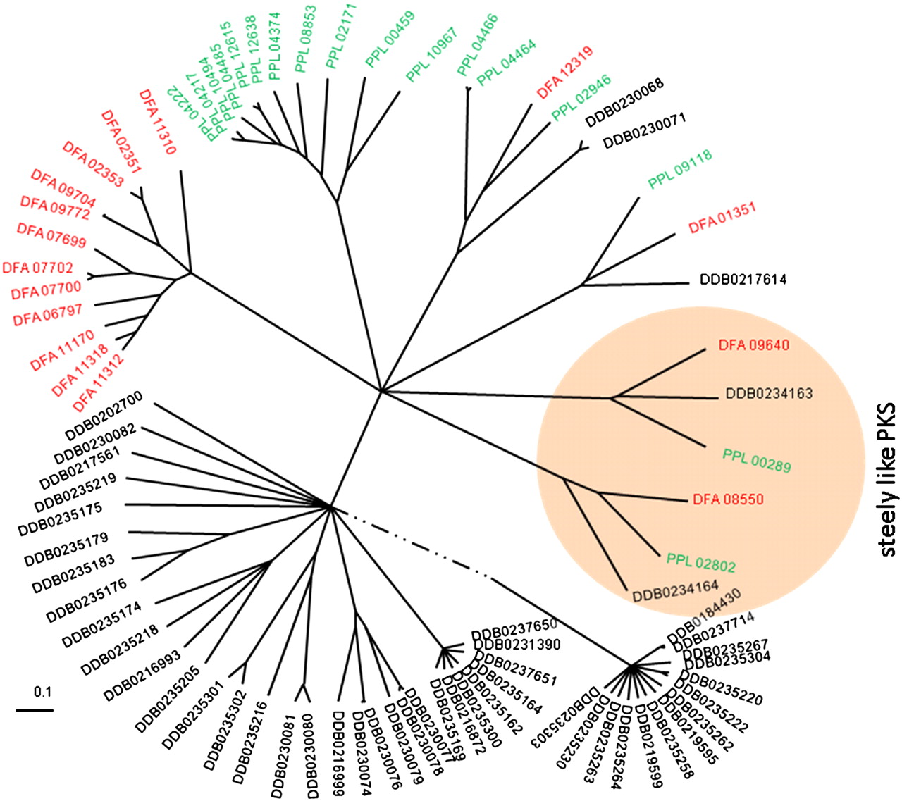 Phylogenetic tree of PKS KS domains of social amoebae. The domains were extracted from the PKS proteins using hmmer models of DD-specific domains (Zucko et al. 2007). A ClustalW alignment was fed in the phylogeny software puzzle (Schmidt and von Haeseler 2007) and confirmed by neighbor-joining analysis using PHYLIP (Felsenstein 1989).