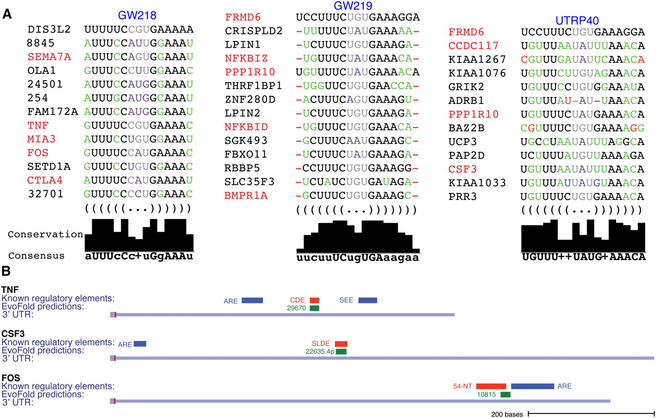 Immune-related families. (A) Alignment of human sequences of members of three immune-related families. UTRP40 includes some additional members not found in the GW families. The families are enriched for macrophage-related genes and GO immunity term association (red). Substitutions are color-coded as in Figure 2. The stems are generally more conserved (black bars) than the loops (predictions without gene symbols are labeled by EvoFold id). (B) Family members (green) overlap with known stabilization/destabilization elements (red). All three genes also have known AREs (blue) (including the ARE-like stability and efficiency element, SEE) (Hel et al. 1998).