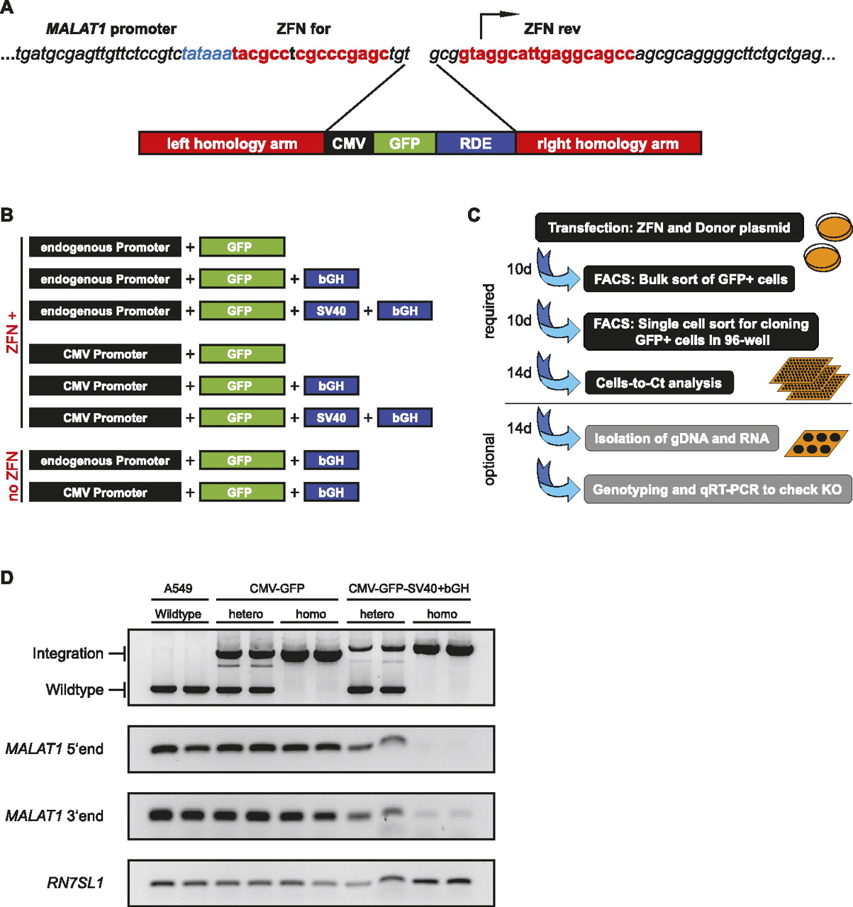 Silencing of endogenous genes by integration of RNA destabilizing elements. (A) Genomic MALAT1 region targeted by the ZFNs. The ZFNs cut between the MALAT1 TATA box (blue) and the transcriptional start site (arrow). The binding site for each ZFN is depicted in red. The site-specific integration via HR is mediated through the left and right homology arms surrounding the integration cassette containing GFP and the RDE. (B) Integration constructs used in our MALAT1 gene silencing approach. The constructs were either transfected with or without ZFNs. (C) Overview of the silencing approach. Cells were transfected with a pair of ZFNs and a repair template containing the RDE of choice, e.g., poly(A) signal. The successful gene silencing was validated via qRT–PCR and followed by genotyping. This protocol allowed the creation of single-cell clones with validated genotype and reduction in target gene expression within 6 to 8 wk. (D) Genotype–phenotype relationship of selected clones. Single cell clones (A549 wild-type, CMV-GFP, CMV-GFP-SV40+bGH) were genotyped via integration-sensitive PCR to discriminate between heterozygous and homozygous clones. The effective integration gave rise to a longer PCR product and was not present in wild-type cells. MALAT1 RNA expression was analyzed via RT–PCR using two independent primer pairs, detecting the 5′-end or the 3′-end of MALAT1. Only the homozygous, biallelic integration, including the RDE, yielded an efficient silencing of full-length MALAT1. The detection of RN7SL1 is shown as loading control.