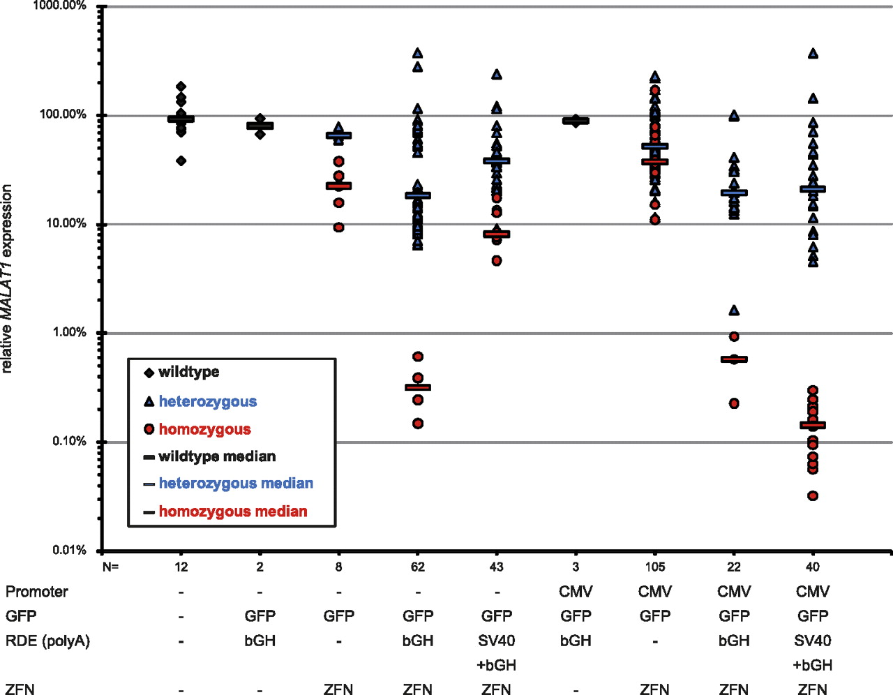 Genotype–phenotype correlation in single-cell clones. For 297 clones, the genotype was determined. In a pristine correlation, the lowest MALAT1 levels were only found in homozygous clones harboring biallelic RDE integration (red). The homozygous integration of “CMV-GFP-SV40+bGH” (last column) yielded clones with <0.1% MALAT1 expression (median = 0.14%). Displayed are the MALAT1 expression levels of individual clones, as well as the median expression levels in the individual groups (Cells-to-CT; reference gene: RN7SL1).