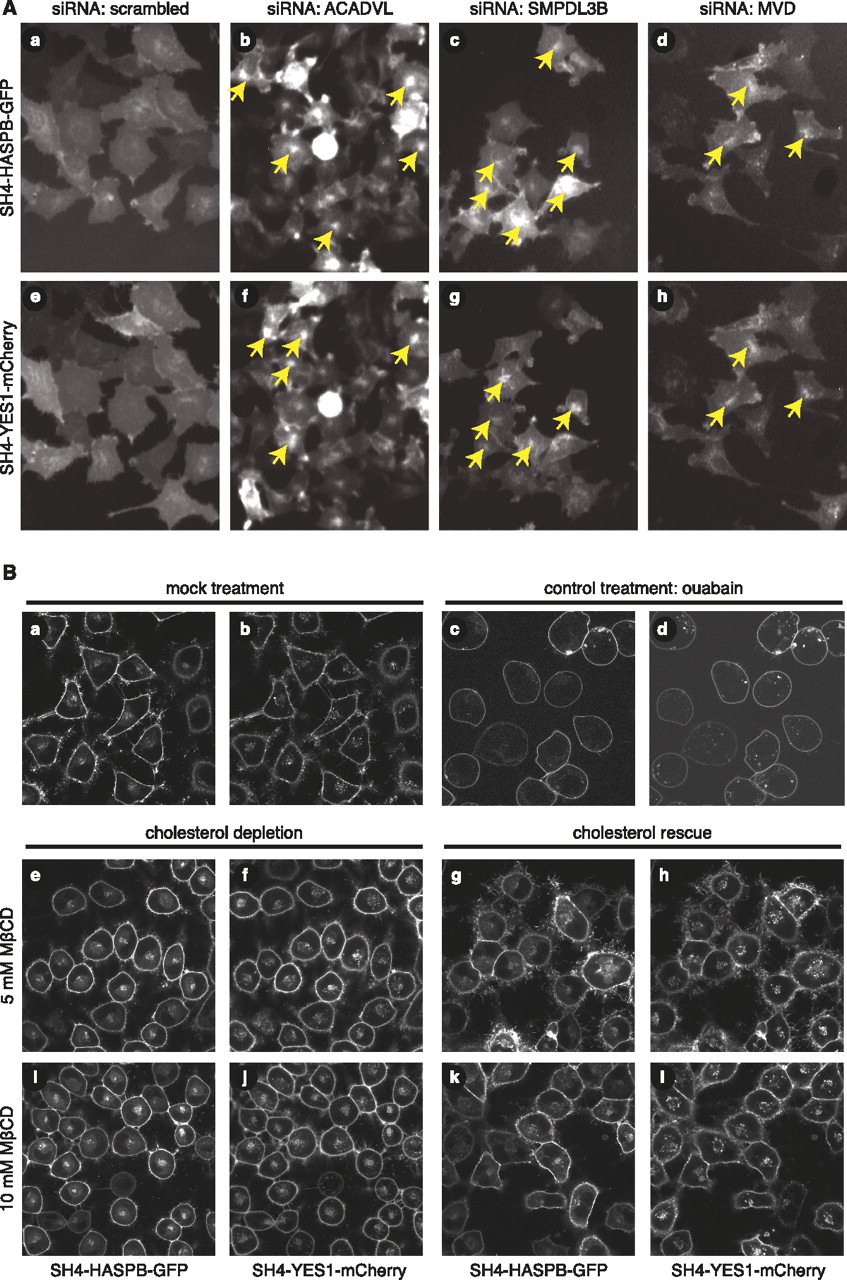 Interference with cellular lipid metabolism by RNAi-mediated down-regulation of metabolic enzymes or pharmacological cholesterol depletion causes intracellular retention of SH4 proteins. (A) HeLa cells expressing SH4-HASPB-GFP and SH4-YES1-mCherry were reverse-transfected with a scrambled siRNA (a,e) and siRNAs targeted against acyl-coenzyme A-dehydrogenase, very long chain (ACADVL) (b,f), sphingomyelin phosphodiesterase, acid-like, 3B (SMPDL3B) (c,g), and mevalonate (diphospho) decarboxylase (MVD) (d,h) and subjected to live-cell fluorescence microscopy. Enlarged image details from original data from the validation screen are shown. (B) HeLa cells expressing SH4-HASPB-GFP and SH4-YES1-mCherry were treated with methyl-β-cyclodextrin (MβCD) to deplete cellular cholesterol and analyzed by live-cell confocal microscopy to determine the subcellular localization of SH4 fusion proteins. Subsequently, the same cells were supplemented with cholesterol and analyzed by live-cell confocal microscopy again. Control cells were treated with 50 mM ouabain and analyzed by live-cell confocal microscopy.