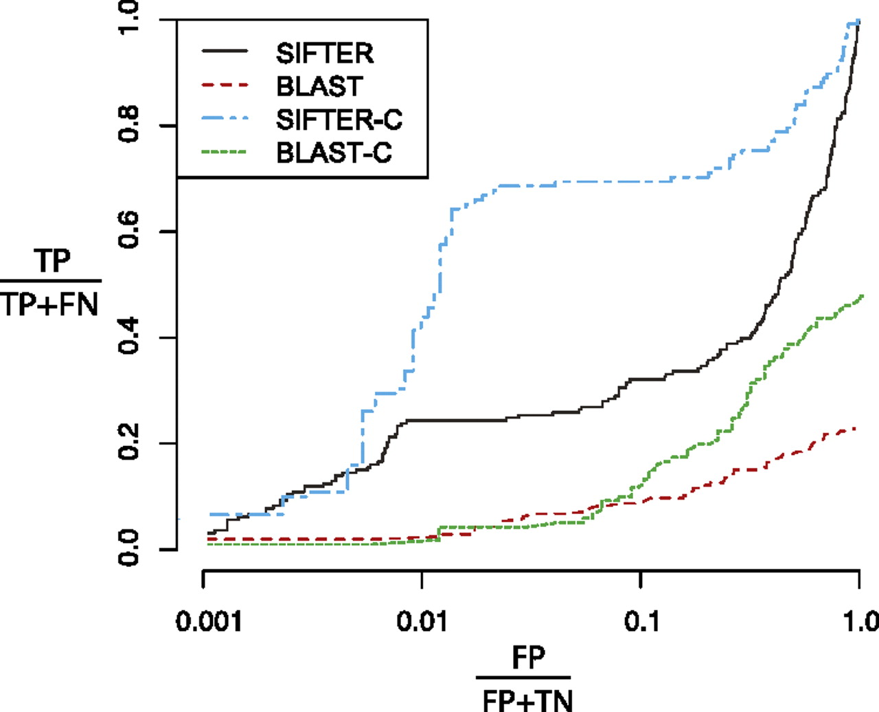 A comparison of BLAST and SIFTER for the Nudix family of proteins. SIFTER consistently dominates BLAST annotations under this criterion. The SIFTER-C and the BLAST-C lines are the evaluation of SIFTER and BLAST using the generalized Nudix hydrolase terms as experimental annotations. It is interesting that, at >99% specificity, both BLAST and SIFTER performed as well or better on the original data sets than the generalized data sets. Note that the x-axis is on a log scale.