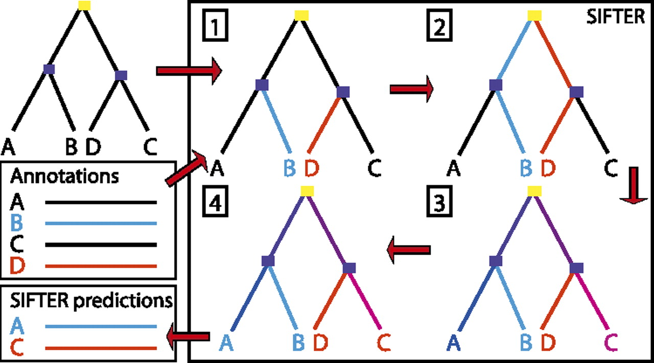 Overview of SIFTER method. (1) A reconciled protein phylogeny and a file containing some of the family's proteins with annotations (blue and red functions) are input into SIFTER. SIFTER incorporates the observations from the annotation file into the phylogeny. (2) Message passing propagates the observations from the leaf nodes to the root of the tree. (3) Message passing then propagates information from the complete set of observations back down to the leaves of the tree, enabling extraction of posterior probabilities at every node in the tree. Intuitively, posterior probabilities at a node take into account every observation scaled by the tree distance. (4) Predictions can be extracted from the tree using, in our case, the function with the maximum posterior probability for each protein.