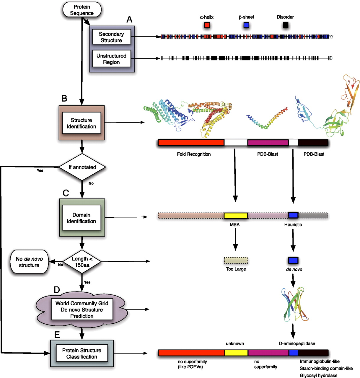 Flow diagram of the proteome folding pipeline using Lactobacillus prophage hypothetical protein Ljo_0324 as an example. (A) The Ljo_0324 sequence is first annotated with primary and secondary structure (PSIPRED, DISOPRED, and [not shown] TMHMM, COILS, and SignalP). (B) PDB-BLAST (PSI-BLAST) and fold recognition (FFAS03) are then used to compare the input sequence to the PDB database to identify a similar sequence/structure. (C) Regions of the protein sequence still unannotated are processed by Pfam, multiple sequence alignments (MSA), and a heuristic method for domain identification. (D) Domains <150 amino acids are then sent to the computational grid, where the three-dimensional structure is predicted by Rosetta. (E) Finally, domains with structural annotations (de novo, BLAST, or fold recognition) are classified into SCOP superfamilies. Regions annotated in each level of the figure are outlined in black, and regions annotated in previous levels are outlined in dotted lines. This example can be found online at http://www.yeastrc.org/pdr/viewProtein.do?id=2155068.