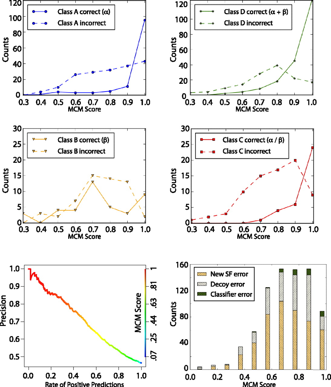 Distribution of SCOP superfamily classifications. (Top and middle) A set of 875 protein domains (SAP set) folded by Rosetta and whose structure (or protein with strong sequence similarity) has been solved after our prediction was used to determine the accuracy of our method's ability to correctly classify SCOP superfamilies. Plotted in solid lines and dotted lines are the number of correct and incorrect classifications, respectively. Classifications are broken down by SCOP class A (α; blue), B (β; yellow), C (β–α–β; red), and D (segregated α and β; green). This graph demonstrates that classifications with high MCM scores are the most accurate in classifying the SCOP superfamily. (Bottom left) The precision/yield plot shows the percentage of protein domains in the SAP set classified using SCOP v1.75 for varying precisions. The line is colored relative to MCM score (right axis). (Bottom right) The histogram of superfamily classification error types represents the total number of incorrectly classified models in the SAP set for different MCM score ranges using a previous version of SCOP (v1.67). “New SF error” is the error due to a new superfamily (i.e., the true superfamily was not represented in the structure comparison set), 62% of total error. “Decoy error” is the error due to insufficient de novo model quality, 28% of total error. “Classifier error” is the error due to the superfamily classifier being inaccurate, 10% of total error.