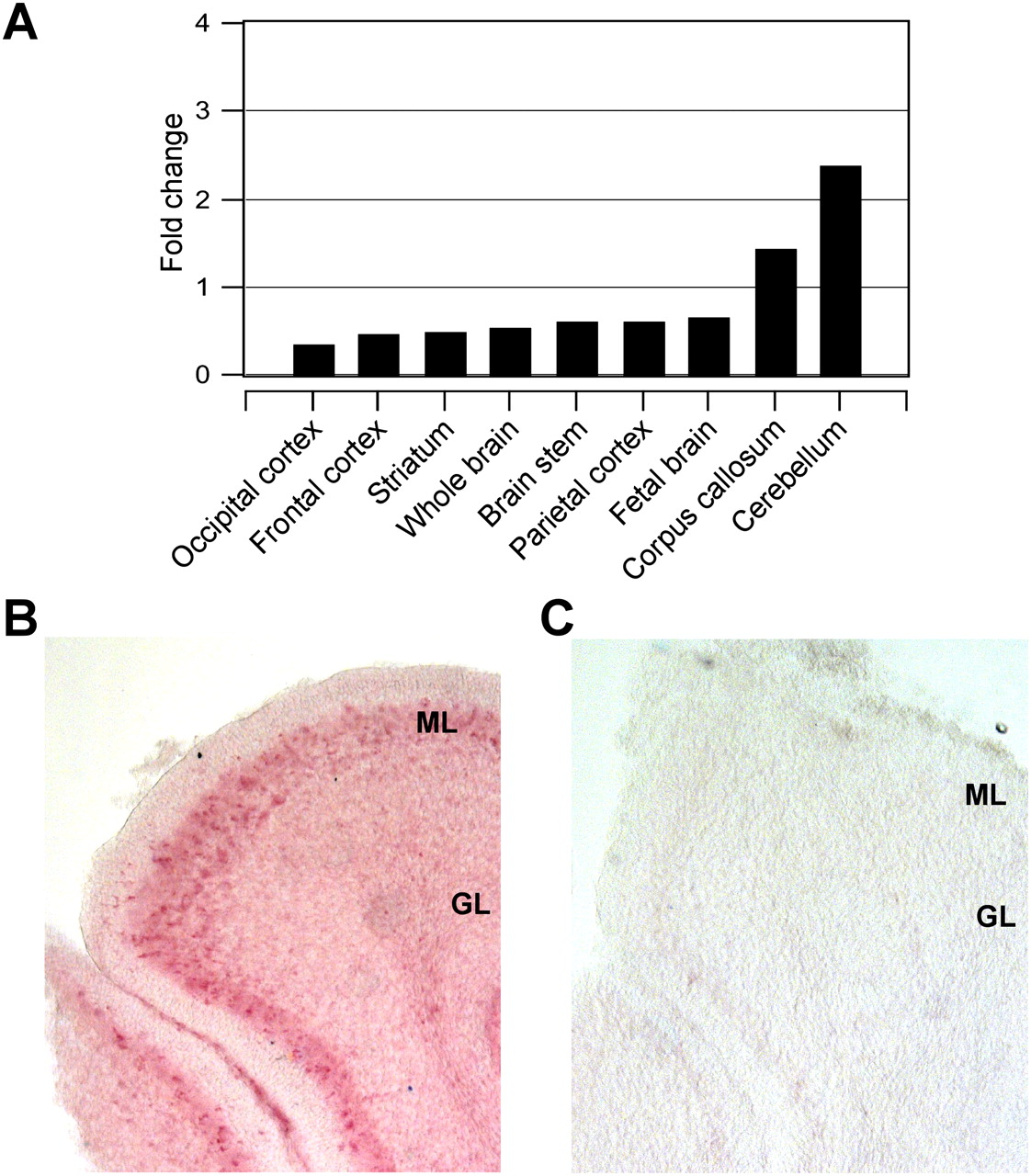 Expression pattern of WDR81 in brain. (A) Expression in human brain with highest levels in cerebellum and corpus callosum. (B) In situ hybridization of mouse embryonic brain revealing increased expression of Wdr81 in purkinje cells and molecular layer of cerebellum. (C) No hybridization was observed with the sense probe. (ML) Molecular layer, (GL) granular layer.