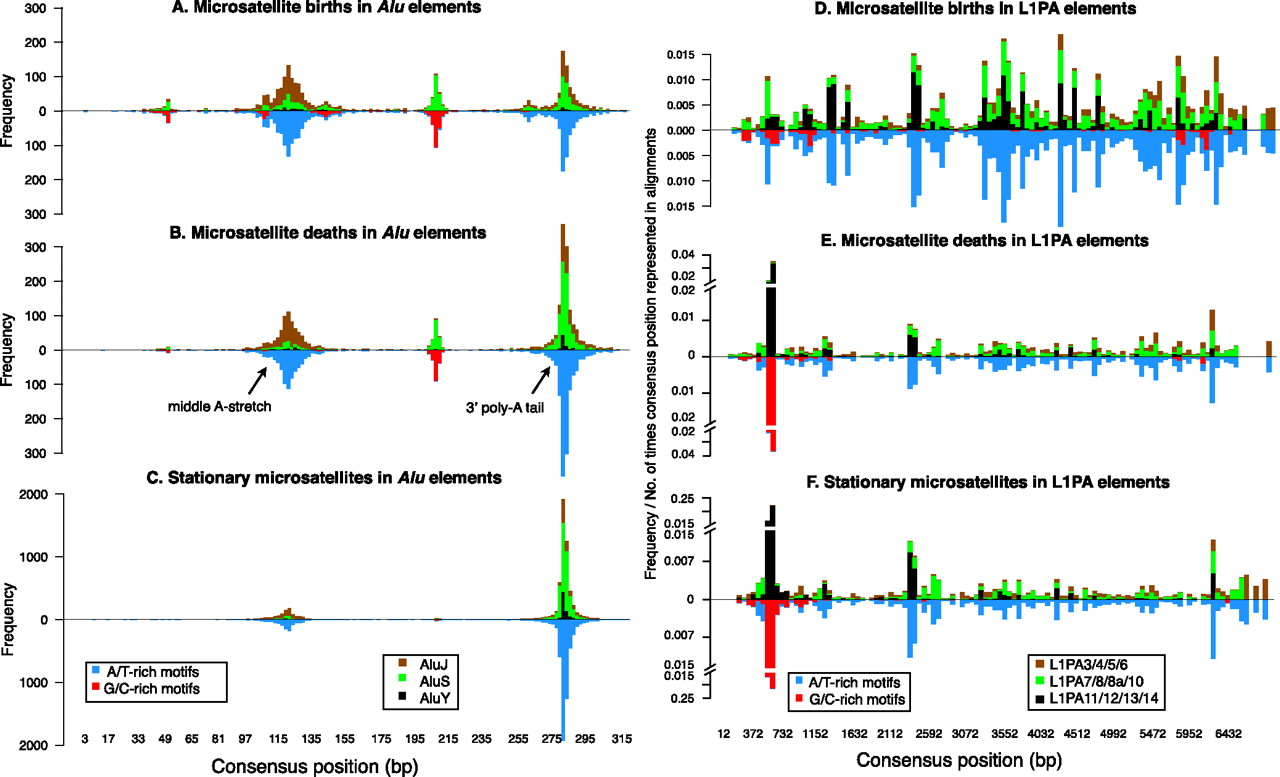 Frequencies of microsatellite births (A), deaths (B), and stationary loci (C) in different Alu subfamilies along the Alu consensus sequence divided into 20-bp bins, and “frequency per alignment count” (see Methods) of microsatellite births (D), deaths (E), and stationary loci (F) in L1PA subfamilies along the L1PA consensus sequence divided into 60-bp bins (and corrected for L1PA sequence representation in alignments). In each plot, bars are decomposed and color-coded by different Alu/L1 subfamilies and by GC richness of the corresponding microsatellites (above and below horizontal midline, respectively).