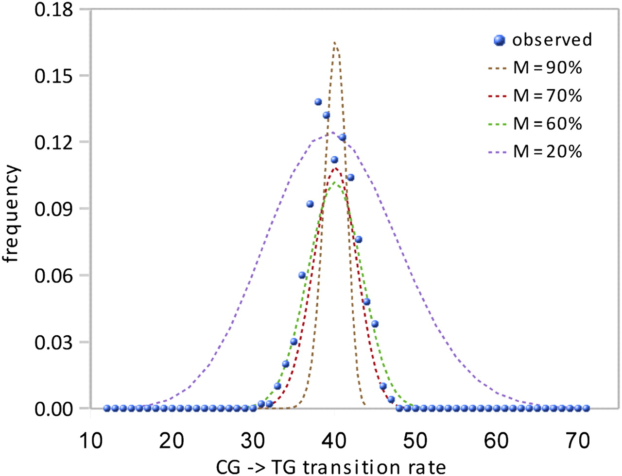 Estimation of the proportion of germline-methylated SUMIs. To estimate the proportion of germline-methylated SUMIs in the 761 SUMIs that are methylated in human, chimp, and orang neutrophils, we calculated CG decay rates in 500 random subsets of these SUMIs. The observed distribution of decay rates of the subsets is shown by the blue circles. Simulated distributions calculated for different proportions of methylated SUMIs are shown by the dotted lines. The variance of the distribution is a measure of the proportion of methylated and unmethylated SUMIs in the 761 SUMIs: A small variance indicates that most of the SUMIs are methylated (curve for M = 90%); a large variance indicates that most of the SUMIs are unmethylated (curve for M = 20%). The value of M that gives the best visual fit to the distribution of observed rates is between 60% and 70%.