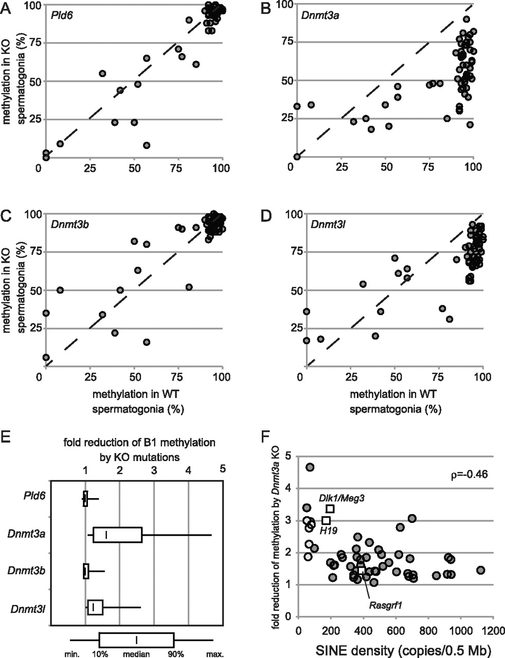 Effects of mutations in piRNA biogenesis and DNA methyltransferases on de novo B1 methylation. Methylation levels (y-axis) at individual B1 loci in spermatogonia of Pld6−/− (A), Dnmt3a2lox/1lox TNAP-Cre (B), Dnmt3b2lox/1lox TNAP-Cre (C), and Dnmt3l−/− (D) are plotted against their methylation levels in wild-type spermatogonia (x-axis). Dashed lines show the y = x slope. (E) Fold reductions in individual B1 methylation due to mutations. Only the data for B1 loci with ≥80% methylation in wild-type spermatogonia are included. (F) Fold reductions in methylation due to Dnmt3a KO mutation at individual B1 loci (dark gray circles) are plotted against the SINE density in the flanking genomic regions (0.25 Mb of each side). B1 loci selected from SINE-poor domains (B1_101–B1_105) are shown as light gray circles. The methylation levels at three paternally methylated regions for genomic imprinting (H19, Dlk1/Meg3, and Rasgrf1) in wild-type and Dnmt3a KO spermatogonia were examined as described previously (Kato et al. 2007), and the results are shown as open squares. Spearman's correlation coefficient (ρ) is shown on the right.