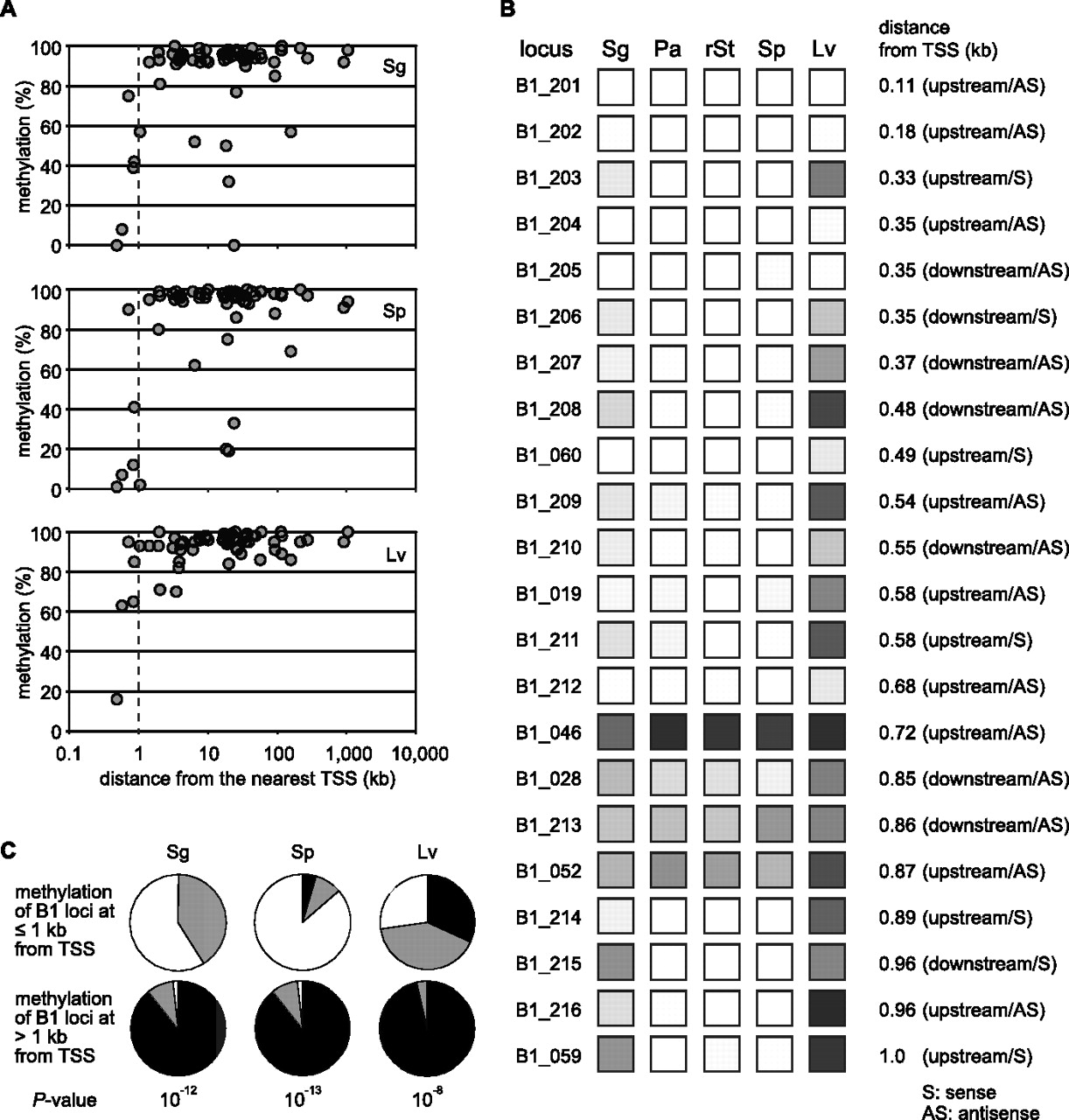 DNA methylation levels and proximity to TSSs. (A) Methylation levels at individual B1 loci (y-axis) are plotted against their distances to the nearest TSS (x-axis). Results for spermatogonia, spermatozoa, and liver are shown. Results for pachytene spermatocytes and round spermatids were nearly the same as those for spermatozoa (see Fig. 1C). (B) Methylation levels at B1 loci (B1_201–B1_216) that are present at <1 kb from TSS are shown on a grayscale as in Figure 1C. TSS-proximal B1 loci in the initial group (B1_060, B1_019, B1_046, B1_028, B1_052, and B1_059) are also included. (C) Statistics for B1 methylation and their distances from TSS. The 78 B1 loci (62 + 16) are categorized into those at ≤1 kb from TSS (upper pie charts) and those at >1 kb (lower pie charts). The loci are further categorized into 0%–19% methylation (white), 20%–79% methylation (gray), and 80%–100% methylation (black). The P-values from χ2 tests are shown at the bottom.