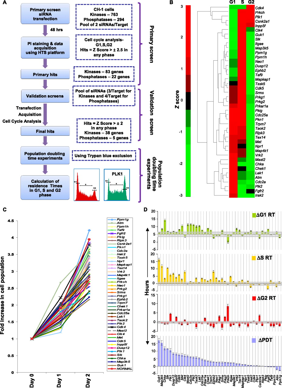 Design of the siRNA screen and the cell cycle phase–specific effects of the identified targets. (A) Schematic of the strategy used to identify genes involved in cell cycle regulation. The overall z-factor obtained for our screen was 0.56, confirming its high overall quality. Details of the design, assay validation, and target verification are provided in the text, Supplemental Experimental Procedures, and Supplemental Figures S1 and S2. (B) The hierarchical clustering of the siRNA hits according to the observed phenotype on cell cycle. The dendogram represents the various clusters of genes identified by our screen for the observed cell cycle distribution pattern. This pattern is based on the normalized z-scores of each of the siRNA hits in the respective cell cycle phases. (C) The range of observed changes in proliferation rate. The population growth curves of CH1 cells obtained in response to transfection with either nonsilencing siRNA (NORMAL), or with siRNA against each of the validated hits are plotted. Here, cells were plated at 48 h after siRNA transfection (Day 0), and results are plotted in terms of the fold increase in cell number at the indicated time points. Values are the mean of three separate determinations. The subset highlighted by the bracket indicates those target-specific siRNAs that produced a significant increase in the population doubling times (P-value < 0.05, as indicated by the asterisk). (D) A further analysis wherein the results in panels B and C were combined to determine the effects of siRNA-mediated target silencing on residence time (RT) of the individual cell cycle phases. Changes (Δ), relative to the corresponding values in GFP-silenced cells, in PDT and RT of the individual phases are shown here as the mean (±SD, gray bar) of three experiments. Details of their calculation are provided in Supplemental Figure S3.