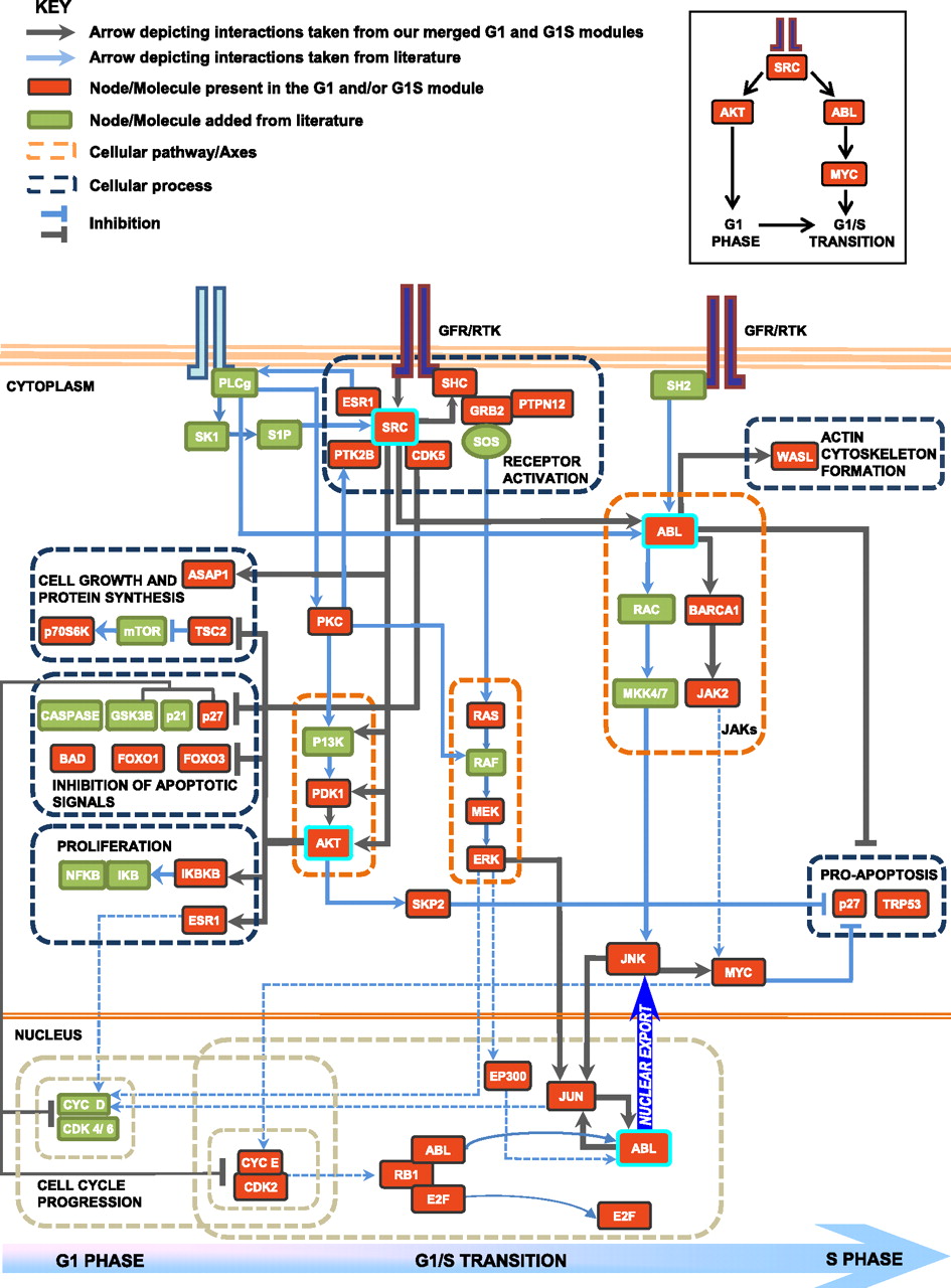Network of core pathways that mediate commitment of cells to the division cycle. In the pathway model, the nodes in red are proteins that are present in the G1 and/or G1S modules. Nodes present in green are derived from the literature (they include intermediates or effectors of cellular processes captured by our merged modules). The gray arrows depict interactions taken from the merged G1 and G1S modules. The blue arrows are links added from the literature. The dotted orange boxes highlight cellular signaling pathways, and the dotted gray boxes group molecules involved in regulating similar cellular processes. The dashed blue arrows indicate a known role of the source node in regulating the target node, derived from the literature. AKT and PTK2B are G1-specific high-stress and betweenness nodes. SRC and GRB2 show high stress and betweenness in both modules. ABL and JUN are present as high-stress betweenness nodes only in the G1S modules. A detailed description of the pathways captured is given in the Supplemental Material.
