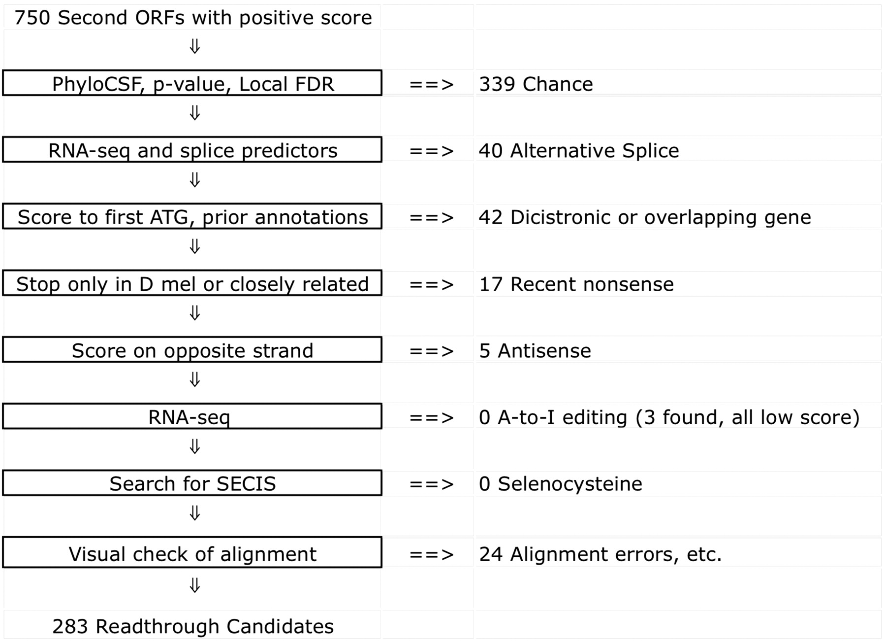 Manual curation distinguishes 283 readthrough candidates. Steps of filtering method used to eliminate transcripts with other plausible explanations for the observed second-ORF protein-coding selection, leading to the final list of 283 unambiguous readthrough candidates.