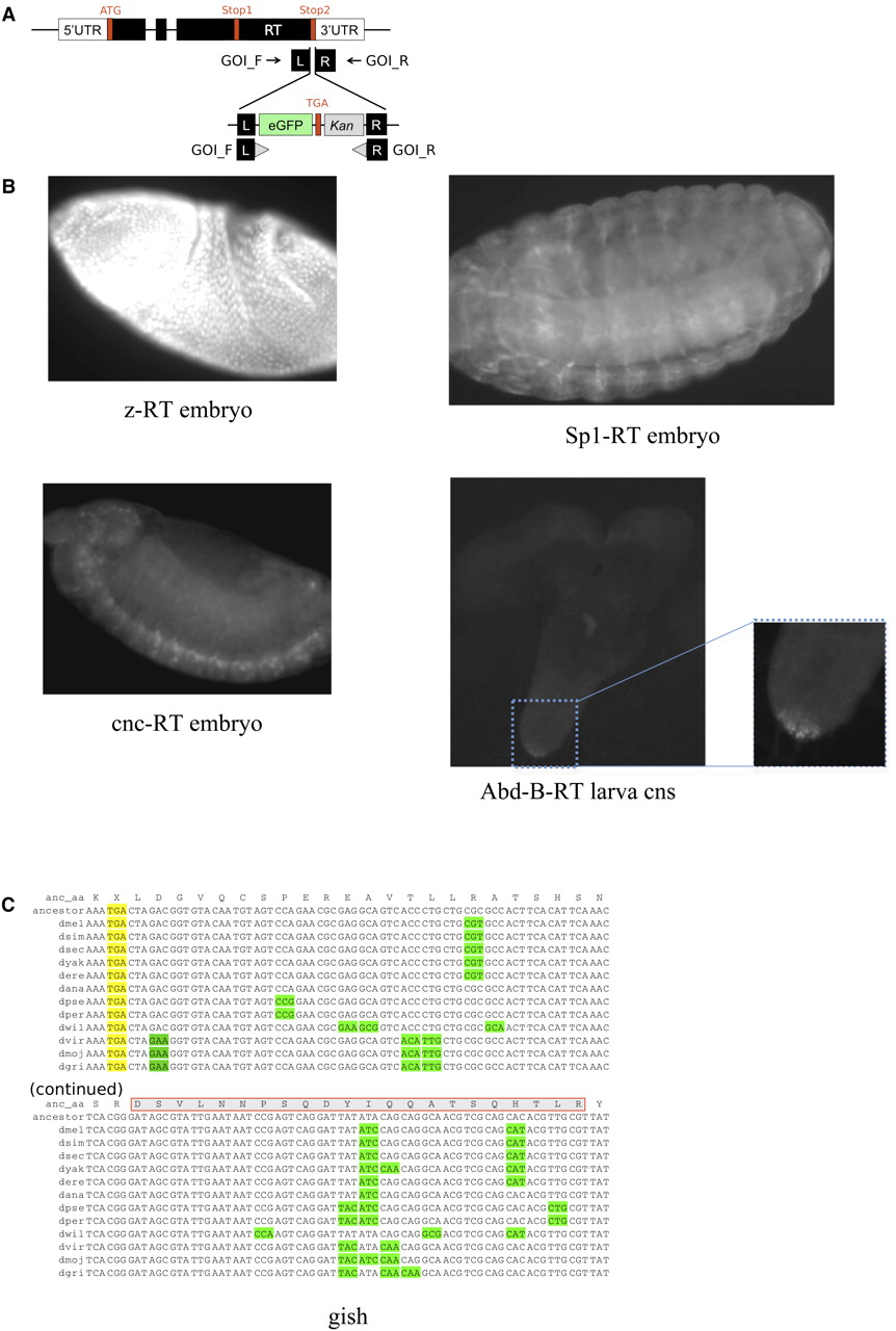 Experimental validation of readthrough. (A) GFP insert construct replacing the second stop codon so that GFP is only observed after translation of the 3′ end of the second ORF and subsequent eGFP gene. GOI_F and GOI_R are 50-bp homology arms on the forward and reverse strands specific to each gene of interest (GOI). (B) Expression of GFP in transgenic constructs showing that translation continues through to the second stop codon for four of the readthrough (RT) candidates. Strains shown are z-RT, Sp1-RT, and cnc-RT in embryos, and Abd-B-RT in the central nervous system of a larva. No GFP expression was found in a wild-type strain used as a control (Supplemental Fig. S12). (C) Mass spectrometry evidence of readthrough. Example of readthrough region (gish) supported by a 22-amino-acid peptide match (red rectangle) to mass spectrometry Drosophila PeptideAtlas (one of nine cases). With no ATG codon between the stop codon and the peptide, and no observed alternative splicing events across thousands of RNA-seq reads overlapping this region, readthrough seems the only plausible explanation for translation of this peptide.