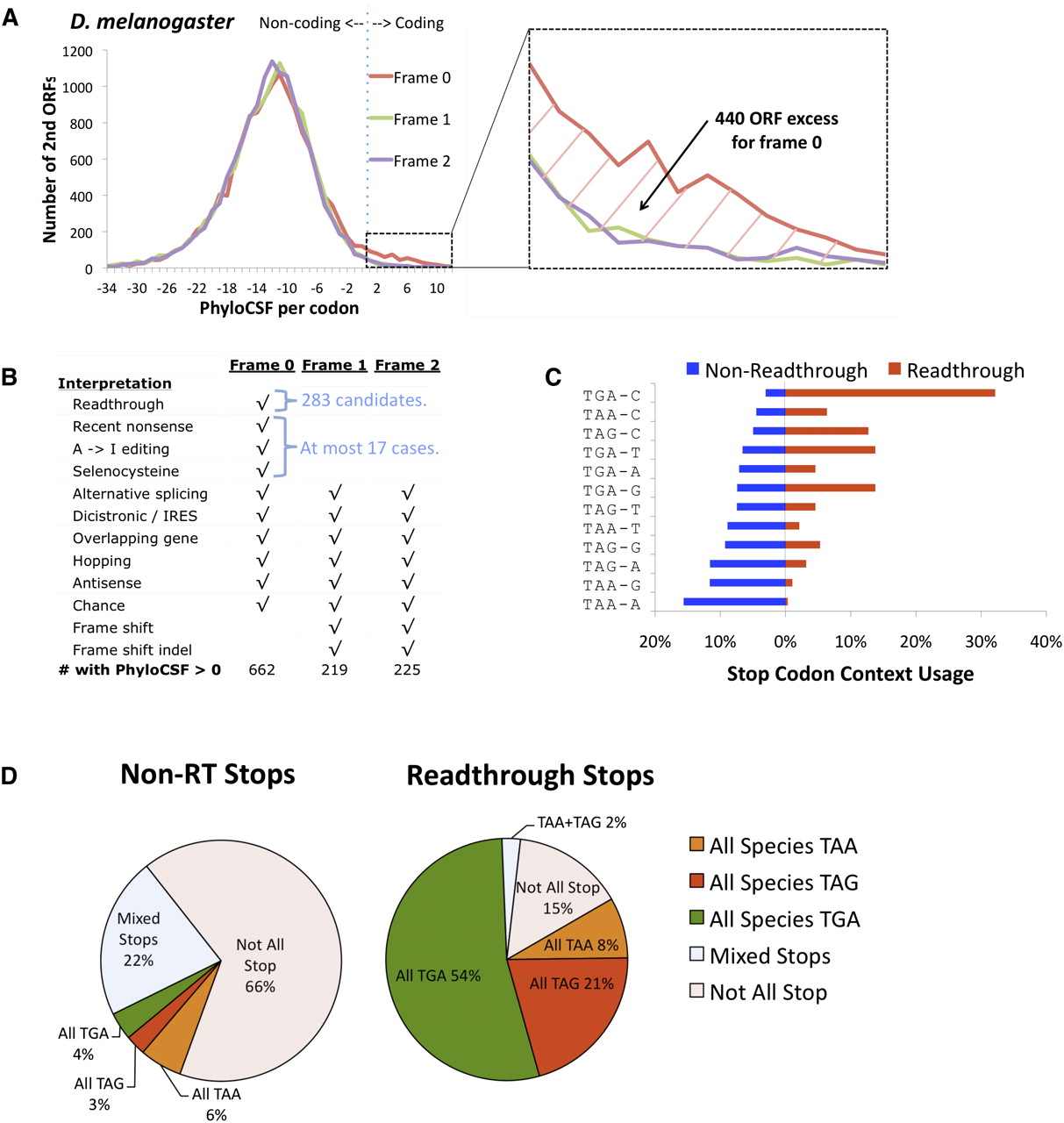 Evidence of readthrough mechanism. (A,B) Excess of high-scoring regions in-frame (frame 0) compared to out-of-frame (frame 1, frame 2) suggests readthrough as the likely mechanism and provides an estimate of readthrough count. (A) PhyloCSF score per codon (x-axis) of the regions starting 0, 1, or 2 bases after all D. melanogaster annotated stop codons (red, green, purple, respectively) and continuing until the next stop codon in that frame, excluding regions that overlap another annotated transcript. Frame 0 shows an excess of more than 400 predicted protein-coding regions compared with the other reading frames, suggesting abundant readthrough. In contrast, a similar plot for Caenorhabditis elegans shows no significant excess in frame 0 (Supplemental Fig. S11), suggesting that the abundance of readthrough in Drosophila is not universal. (B) Possible mechanisms associated with protein-coding function downstream from D. melanogaster stop codons (rows) and associated reading frame offsets where corresponding protein-coding function is expected (columns). Random fluctuations would lead to an even distribution among the three frames, as would unannotated alternative splice variants and unannotated IRESs (note that annotated splice variants and IRESs have already been excluded), while frameshift events and recent frameshifting indels would bias away from frame 0. A bias for in-frame protein-coding selection is expected only for stop codon readthrough, recent nonsense mutations, A-to-I editing, and selenocysteine, the latter three together accounting for at most 17 cases. This leaves readthrough as the only plausible explanation for an excess of ∼420 frame 0 regions with positive PhyloCSF scores. (C) Usage of stop codon context (stop codon and subsequent base) provides additional evidence of a readthrough mechanism. The 4-base contexts are sorted in order of decreasing frequency among the 14,928 non-readthrough stop codons (blue), with less frequent stop codons (top, e.g., TGA-C) experimentally associated with translational leakage in other species and most frequently associated with efficient termination (bottom, e.g., TAA-A). Context frequencies for readthrough candidates (red) are opposite of non-readthrough transcripts, suggesting a preference for leaky context, with one-third using TGA-C and almost none using TAA-A. (D) Increased stop codon conservation in readthrough candidates. Only ∼1/3 of D. melanogaster non-readthrough stop codons have aligned stops in all 12 species, and only ∼1/3 of those are perfectly conserved (i.e., have the same stop codon in all 12 species). In contrast, 83% of candidate readthrough stop codons have an aligned stop in all 12 species, and 97% of those are perfectly conserved. While all three stop codons are involved in readthrough of different genes, individual readthrough genes rarely show substitutions between different stop codons, suggesting that the three stop codons are not functionally equivalent. Moreover, the only eight substitutions observed are between TAA and TAG, with no substitutions involving TGA, even though it is the most frequent readthrough stop codon, suggesting that TAA and TAG are functionally similar.