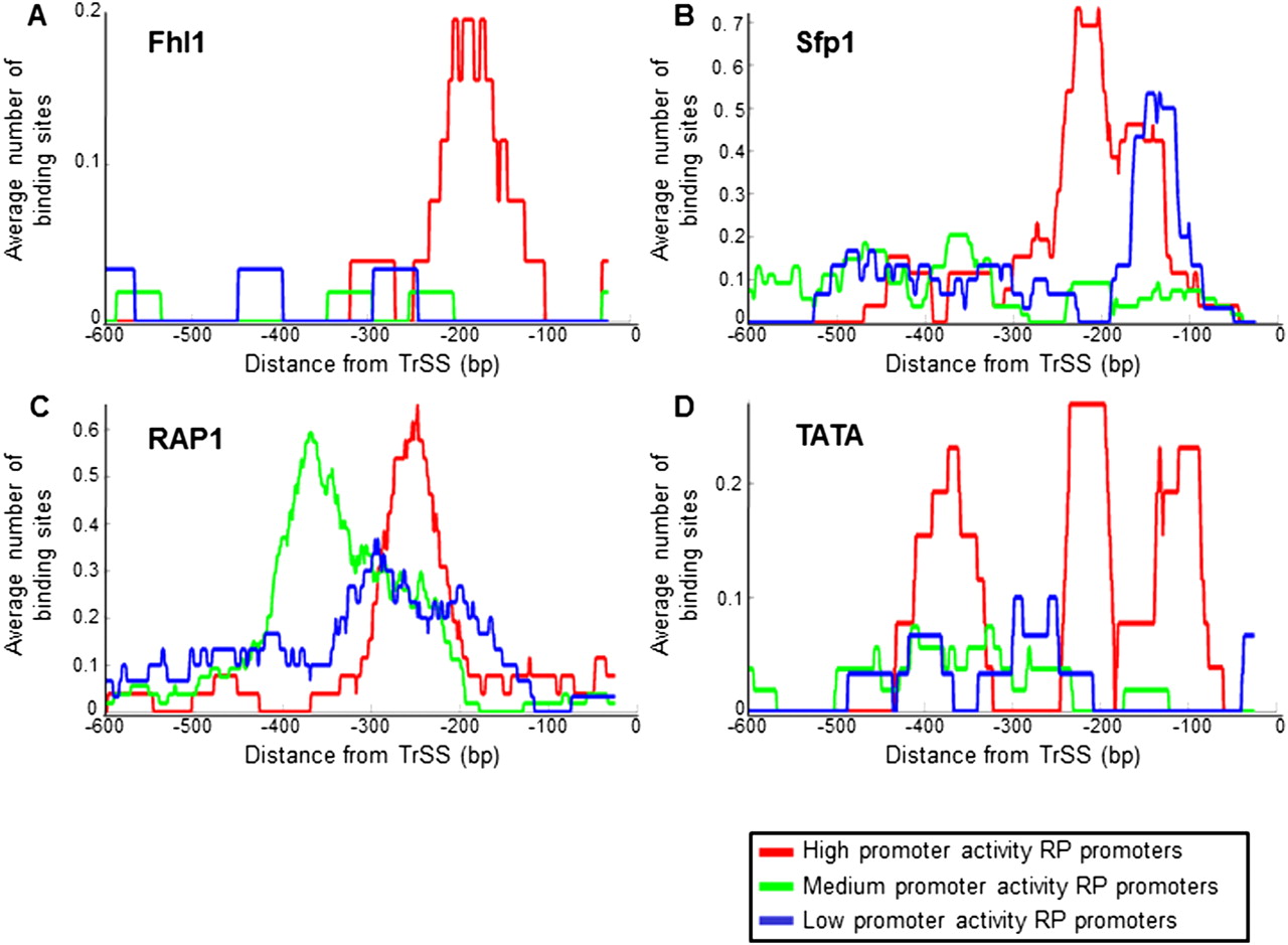 RP promoters with high promoter activities have distinct organizations of transcription-factor binding sites. (A) For each group of RP promoters with high (red), intermediate (green), and low (blue) promoter activities, defined as in Figure 4, the average number of Fhl1 binding sites per promoter as a function of the distance from the translation start site is shown. The plots show a moving average using a window of 50 bp. Fhl1 sites are shown in only one of the two possible orientations and using the binding strength threshold from Figure 4 (see Supplemental Fig. 12 for plots using many possible thresholds). (B) Same as in A, for Sfp1 binding sites, but where sites are counted in both orientations (see Supplemental Fig. 13 for many site thresholds). (C) Same as in A, for Rap1 sites (see Supplemental Fig. 14 for many thresholds). (D) Same as in A, for TATA boxes (see Supplemental Fig. 15 for many thresholds).