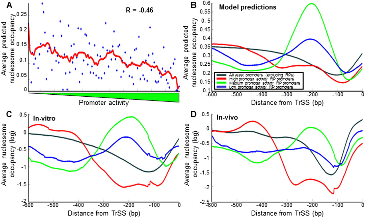 RP promoters with high promoter activities have a lower intrinsic affinity to nucleosomes. (A) For each RP promoter, shown is the lowest average nucleosome occupancy, predicted by a computational model of nucleosome sequence preferences (Kaplan et al. 2009), across any 10-bp region within 200 bp upstream of the translation start site (y-axis). RP promoters are plotted by their measured promoter activity (x-axis). Also shown is a moving average of consecutive RP promoters using a window of 11 promoters (red line). (B) For each group of RP promoters with high (red), intermediate (green), and low (blue) promoter activities, defined as in Figure 4, the average model-predicted (Kaplan et al. 2009) nucleosome occupancy across the group promoters is shown as a function of the distance from the translation start site. (C) Same as in B, but using measurements of nucleosome occupancy in vitro (Kaplan et al. 2009), in which nucleosome positions are dominated by nucleosome sequence preferences. (D) Same as in B, but using measurements of nucleosome occupancy in vivo (Kaplan et al. 2009) during growth in glucose-rich media.