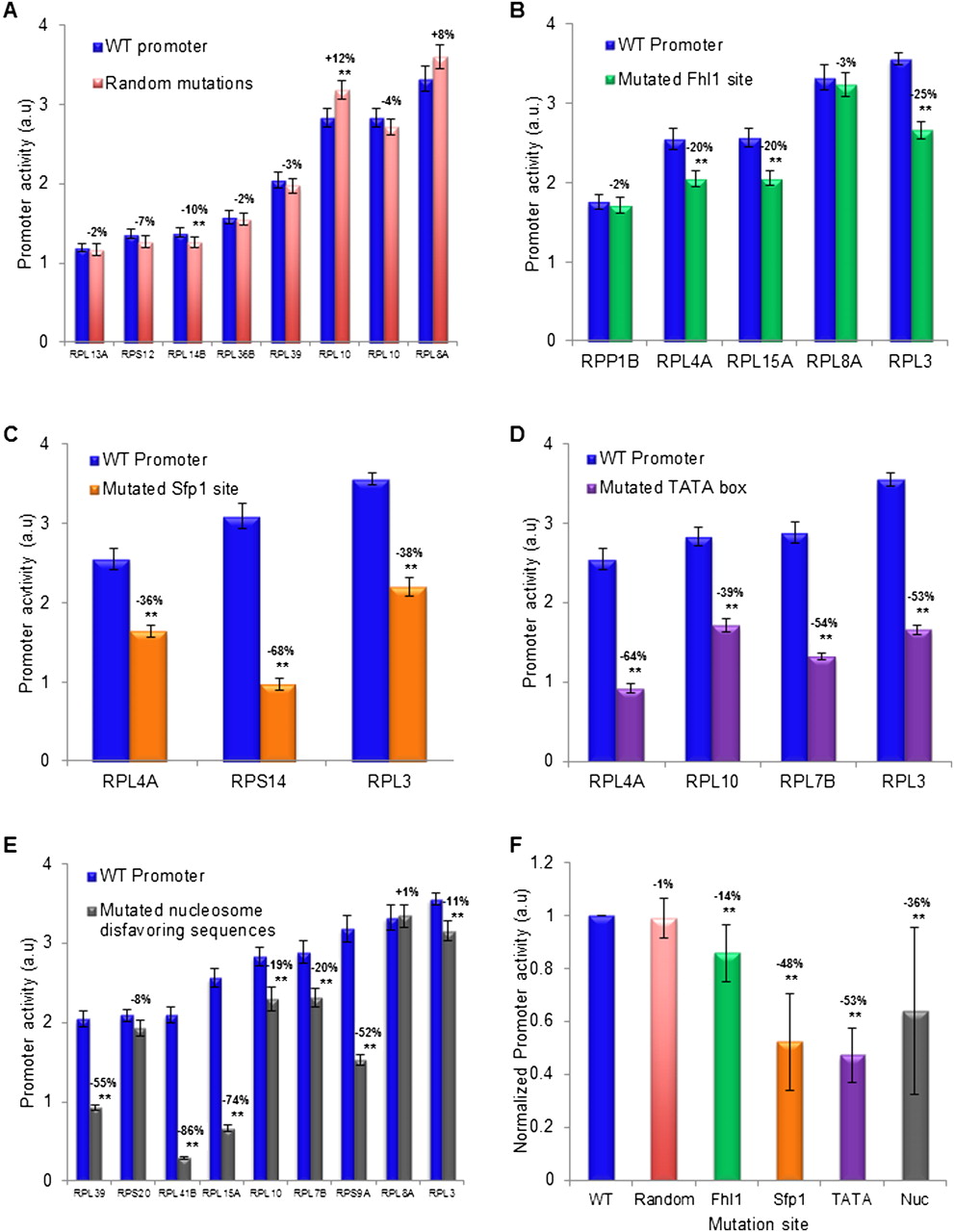 Experimental validation of regulatory elements in RP promoters. (A) The effect of random mutations on RP promoter activity for eight RP promoters. For each promoter, shown is the activity of the natural promoter and a promoter in which a random mutation (1–8 bp sequence changes) was generated. Error bars represent two standard errors computed from 24 replicates. The magnitude of the effect of the mutation on promoter activity is indicated above the activity bars of each promoter pair, where two stars mark promoter activity differences that are statistically significant. (B) Same as in A, for five different mutations of Fhl1 binding sites in five different RP promoters. Mutations of Fhl1 sites were done by 2-bp changes that preserved the G/C content. (C) Same as in A, for three different mutations of Sfp1 sites in three different promoters. Mutations of Sfp1 sites were done by 2-bp changes that preserved the G/C content. (D) Same as in A, for four different mutations of TATA boxes in four different RP promoters. Mutations of TATA boxes were done by 2–3 bp changes that preserved the G/C content. (E) Same as in A, for nine different mutations of nucleosome disfavoring sequences in nine different RP promoters. Mutations to these A/T-rich nucleosome disfavoring sequences were done by replacing 16 A/T base pairs with G/C base pairs in a region of 31 base pairs within the promoter that had the lowest predicted nucleosome occupancy (Kaplan et al. 2009). (F) Summary and comparison of the effect of the mutations according to the type of element mutated. For each type of mutation from A to E, the average and standard deviation of the effect on promoter activity of all of the different mutations done to these elements are shown, where the effect is taken from the numbers above the various bars in A–E, such that the wild-type promoter (WT, leftmost bar) is defined to have a promoter activity of 1.