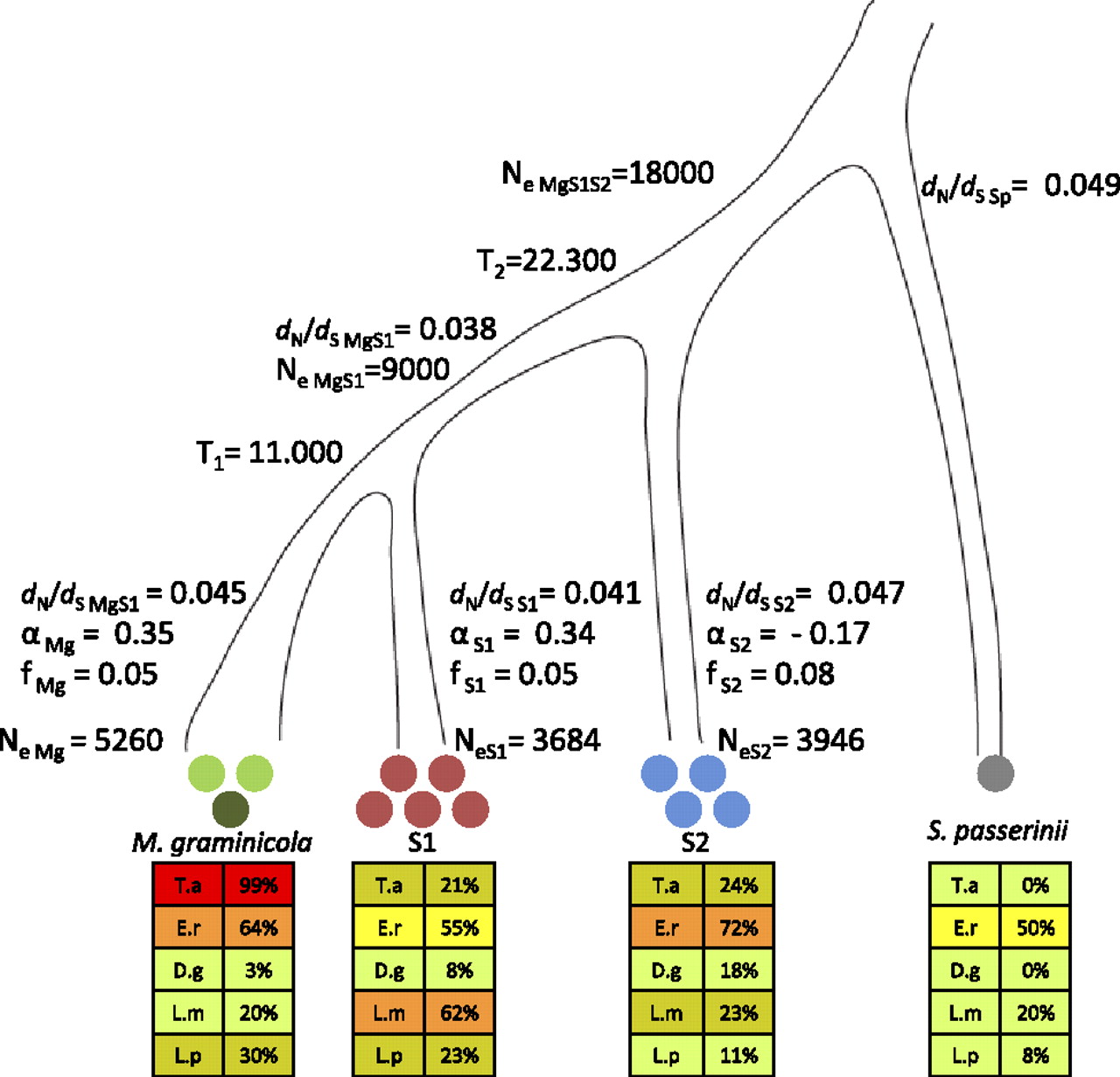 Species tree of M. graminicola, S1, S2, and S. passerinii. Circles indicate the number of genomes sequenced in each species. In our analyses we used the reference sequence of M. graminicola marked as a dark green circle. The lower panels of the figure summarize the ability of each species to infect the five grass species (T.a.) Triticum aestivum, (E.r.) Elymus repens, (D.g.) Dactylis glomerata, (L.m.) Lolium multiflorum, and (L.p.) Lolium perenne. The extent of host adaptation was estimated as percentage of leaf area covered by pycnidia among the different host species. Colors corresponding to the degree of infection are shown as 0%–20% (light green), 21%–40% (brownish green), 41%–60% (yellow), 61%–80% (orange), 81%–100% (red). We used a coalescence approach to estimate the split between M. graminicola and S1 (T1) and the more ancient split between S2 and the M. graminicola-S1 branch (T2). The population sizes of the ancestral species are indicated as NeMgS1 and NeMgS1S2 parameters. The evolutionary rate is estimated as the ratio of nonsynonymous to synonymous mutation rates dN/dS for each branch. Shown are also estimates of the parameter α quantifying the extent of adaptive evolution and the parameter f as a measure of the strength of purifying selection in each of the branches of M. graminicola, S1, and S2 using S. passerinii as the outgroup species. Contemporary effective population sizes were estimated from polymorphism data for each species and are given as NeMg, NeS1, and NeS2.