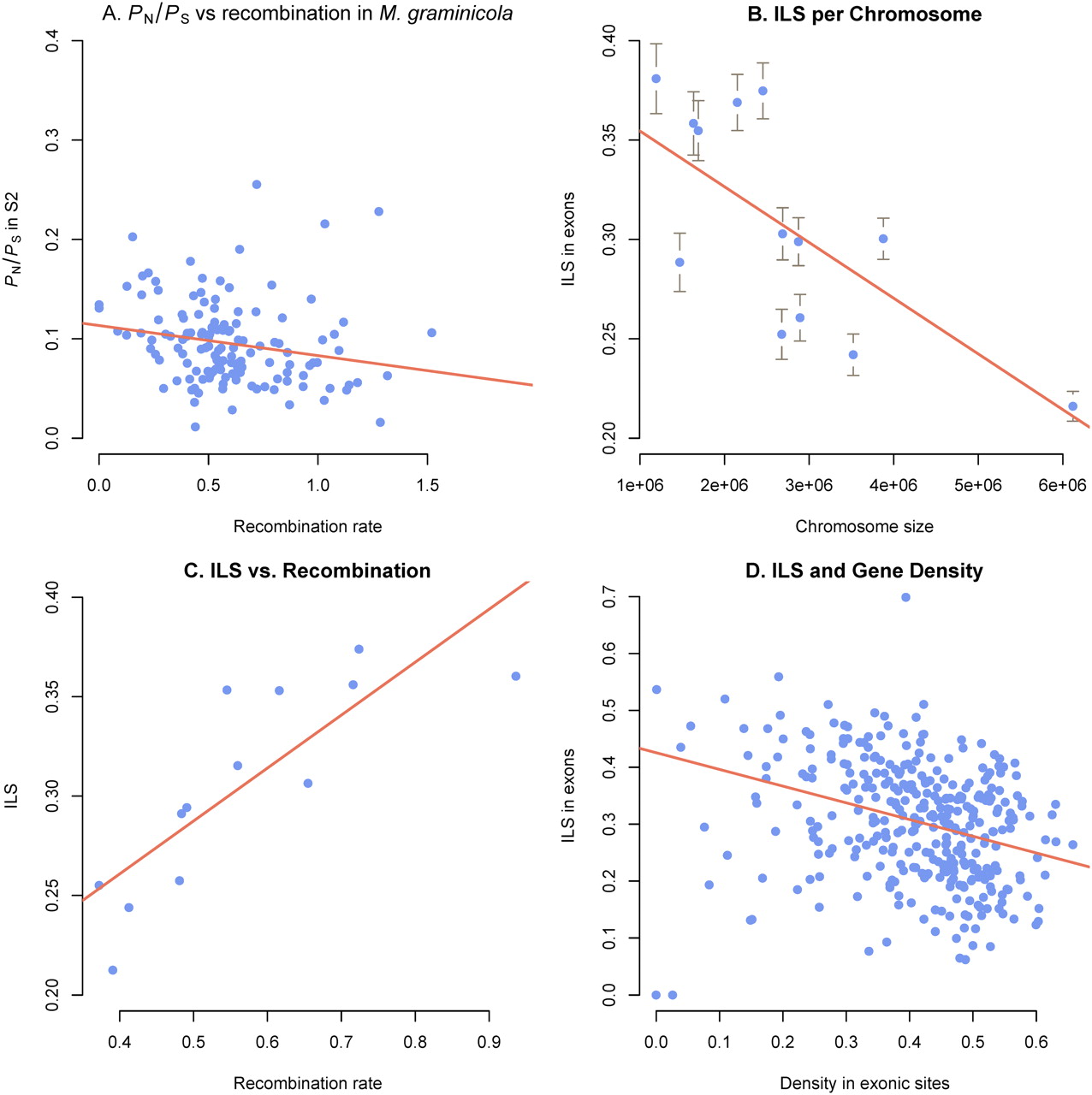 (A) Plot showing the negative correlation between PN/PS in M. graminicola and recombination rate. Both parameters were estimated as averages in windows of 100 kb (160 windows). One outlier window with an average value of PN/PS = 0.5 was excluded from the plot and regression analyses. (B) The frequency of incomplete lineage sorting (ILS) in exons plotted against chromosome size (chromosome 1–13) measured in base pairs. The strong negative correlation demonstrates a higher extent of ILS on smaller chromosomes reflecting the higher recombination rate on the smaller chromosomes. (C) Plot illustrating the positive correlation between the frequency of ILS on each essential chromosome (1–13) and average recombination rates for the same chromosomes. (D) The frequency of ILS in exonic sites plotted against exon density in 100-kb windows. The negative correlation illustrates that regions with a higher density of coding sites show less ILS compared to regions with fewer coding sites.