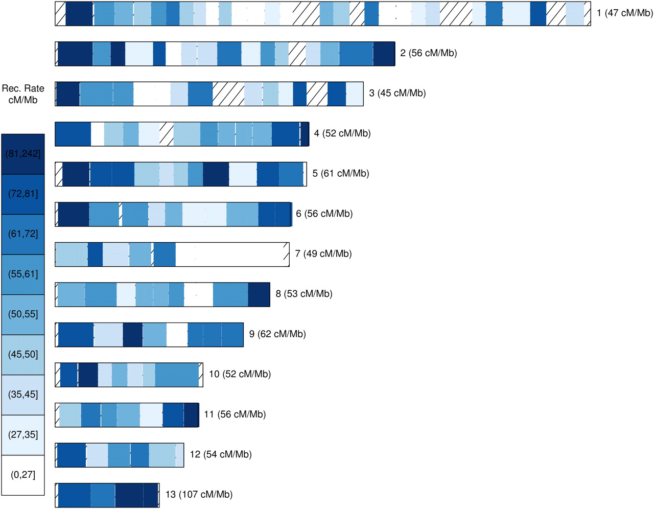 Recombination map of chromosomes 1–13 derived from coalHMM estimates of the parameter rho measured in units of substitutions. rho was estimated in windows of 100 kb along aligned chromosomes of four isolates: the M. graminicola reference genome, one genome of S1 and S2, and the outgroup sequence of S. passerinii. We converted rho to recombination rate measured in centimorgans per megabase (cM/Mb). Color differences indicate differences in recombination rate across chromosomes. The nine categories correspond to the nine quartiles of the observed distribution of recombination rate. Chromosome-wise values shown in parentheses are the median of all corresponding regions. Stripped regions show regions where rho could not be estimated due to insufficient alignment data.