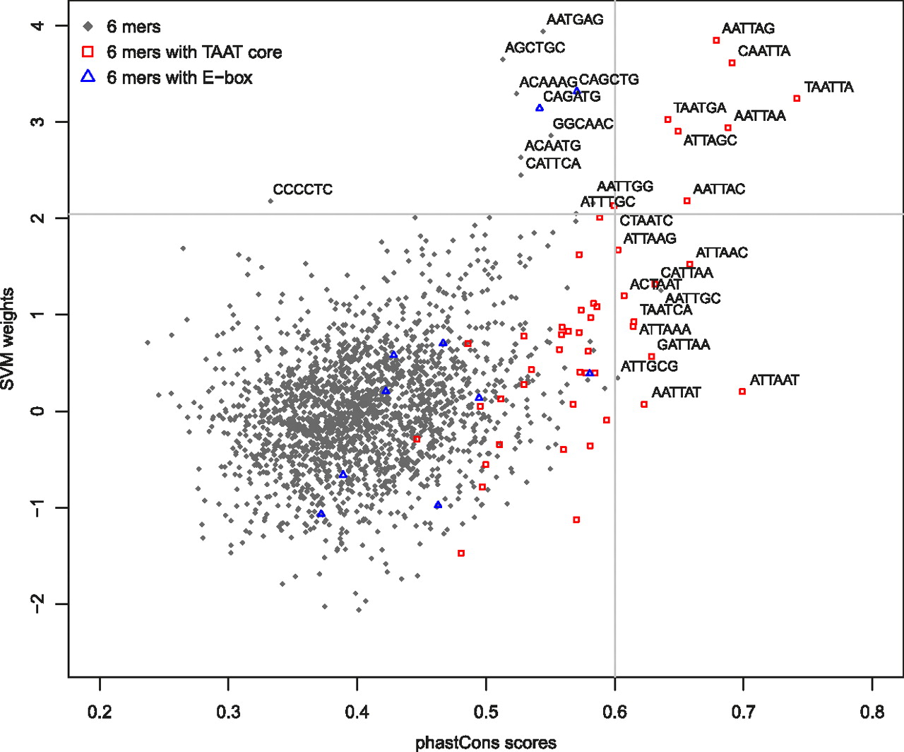 Predictive SVM sequence features are more conserved. Scatter plot between SVM weights and conservation scores (phastCons scores) for 6-mers in forebrain enhancers. Two well-known TFBS, TAAT cores (red rectangles), and E-box elements (blue triangles) are highlighted. Three standard deviations above the mean (corresponding to P-value of ∼0.001) is denoted for each axis independently. The sequence of all 6-mers beyond three standard deviations above the mean is displayed.