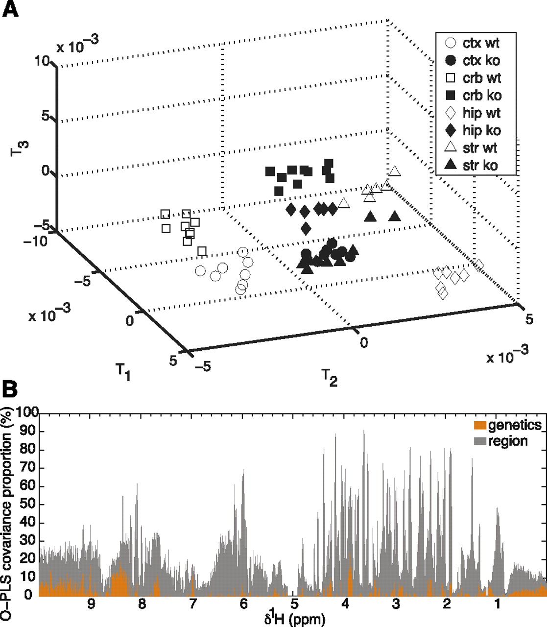 Metabolic signature of Fmr1-deficiency in 12-d-old brain. The metabolic variation observed in 1H NMR spectra acquired in 12-d-old mouse brain samples was modeled using an orthogonal partial least square-discrimination analysis (OPLS-DA). PLS components maximizing the segregation of the groups are computed. Each PLS component corresponds to a combination of the initial 1H NMR spectral variables, known as model coefficients or loadings. Each individual spectrum has new coordinates on the PLS components, known as scores. As a consequence, the three-dimensional OPLS-DA scores plot (A) segregates the different sample groups according to brain region (shapes) and Fmr1-deficiency status (white and black shapes). (B) OPLS variance component model of cortex and cerebellum. (Ctx) cortex, (crb) cerebellum, (hip) hippocampus, (str) striatum, (ko) Fmr1-knockout, (wt) wild-type samples.