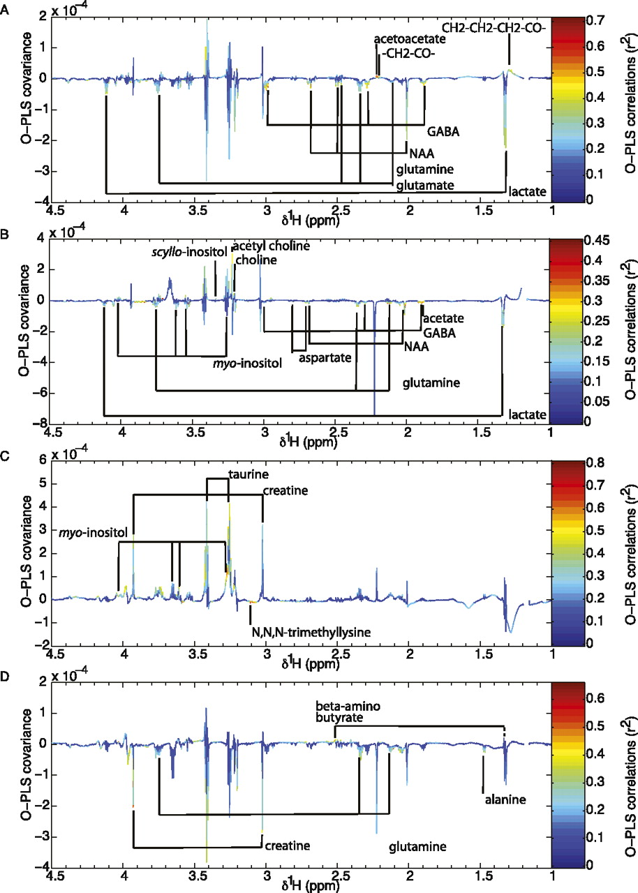 Region-specific metabolic signature of Fmr1-deficiency in 12-d-old brain. Metabolic variations in 1H NMR spectra obtained from Fmr1-null and wild-type mice were assessed independently for each brain region by OPLS-DA. These OPLS-DA models are represented as a pseudo-spectrum. Positive model coefficients correspond to higher metabolite concentrations in KO animals, whereas negative model coefficients are associated with higher metabolite concentrations in WT animals. Metabolic signature as obtained from cortex (Q2Yhat = 0.61) (A), cerebellum (Q2Yhat = 0.57) (B), hippocampus (Q2Yhat = 0.84) (C), and striatum (Q2Yhat = 0.44) (D).