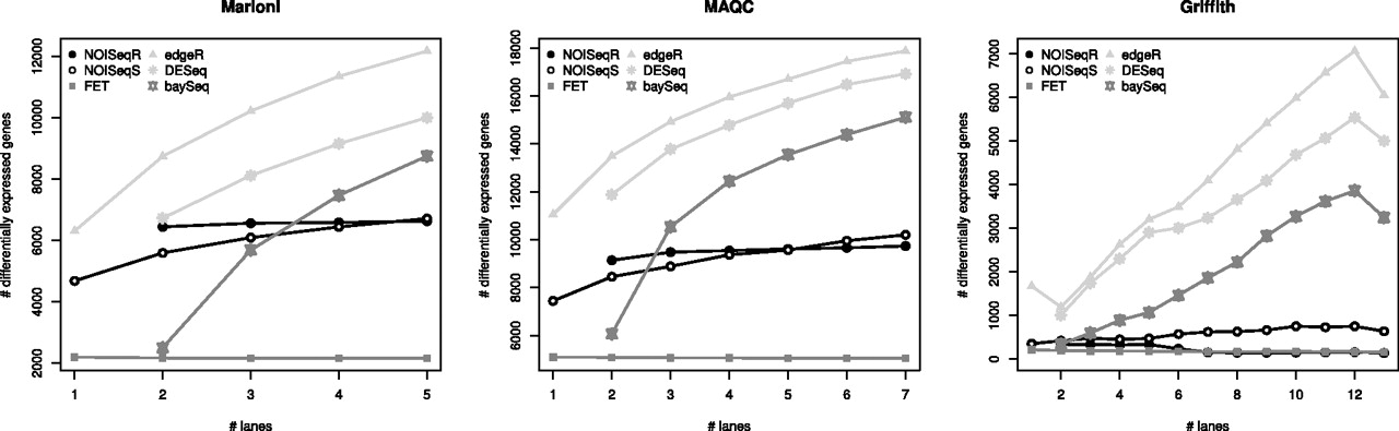 Differentially expressed genes according to sequencing depth for each data set and method. No gene length correction was applied to the data.