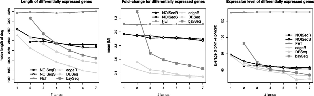 Relationship between gene length, fold-change M, expression level of differentially expressed genes, and the number of lanes used, for each method in MAQC data set. No length