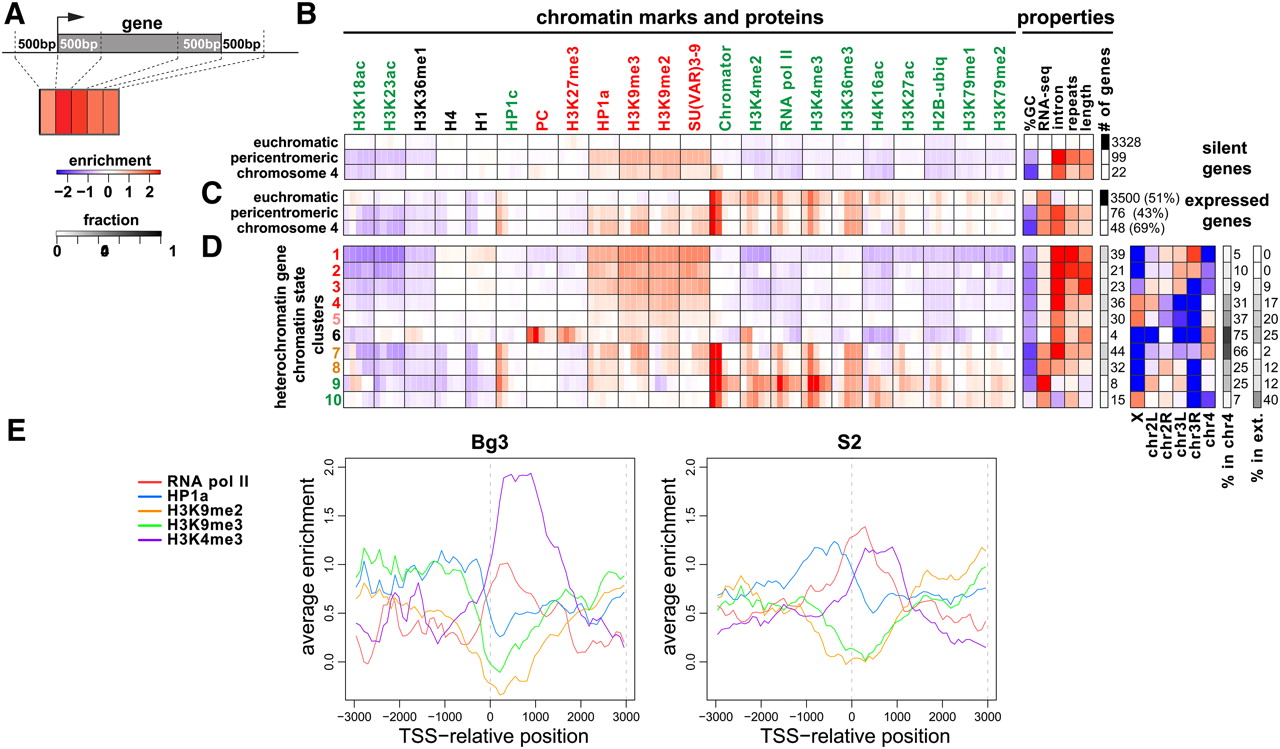 Genes within heterochromatin have specialized properties. (A) The observed chromatin state of each annotated gene was summarized by calculating average enrichment within the 500-bp regions flanking the 5' and 3' ends, the first and last 500 bp within the gene, and the remaining gene body. Each region is represented by the small rectangles (various shades of red in the diagram). Only nonoverlapping genes are considered in this analysis. Levels of modifications and proteins in each gene segment are indicated by shades of red (enrichment) and blue (depletion) in B–D. (B) Average patterns of enrichment for chromatin marks and proteins (log2 scale) for transcriptionally silent genes in BG3 cells. The second panel shows average G/C nucleotide content, repeat content, RNA-seq level, and gene length for each group of genes. The number of genes within each group is indicated in the last column. Transcriptionally inactive genes within heterochromatin and chromosome 4 are highly enriched for H3K9me2/me3, HP1a, and SU(VAR)3-9 over all gene segments, and depleted for most active marks, in comparison to inactive euchromatic genes. (C) Average patterns of chromatin mark enrichment for transcriptionally active genes in BG3 cells. Genes transcribed within the heterochromatic regions show enrichment for “active” marks at comparable levels to expressed euchromatic genes (e.g., H3K36me3, Pol II, H3K4me2/3, and CHRO (a chromodomain protein associated with interband regions on polytene chromosomes; Gortchakov et al. 2005; Rath et al. 2006). However, enrichment levels were noticeably reduced for some active marks (e.g., H4K16ac, H3K18ac, H3K23ac, and H3K79me1/2) compared with active euchromatic genes. Most importantly, the heterochromatic and 4th chromosome genes also contain high levels of HP1a, H3K9me2, and H3K9me3, which are not observed at active euchromatic genes. Expressed heterochromatic genes are, on average, shorter, and contain fewer intronic repeats compared with silent heterochromatic genes (cf. “length” and “repeats” in B and C). (D) Combinatorial chromatin patterns exhibited by heterochromatic genes. Genes were clustered according to their enrichment summary (A) across multiple histone modifications and chromosomal proteins (columns in panel 1; see Methods). Each row shows the average enrichment pattern of the genes within one of the 10 determined clusters. Cluster numbers are color-coded to indicate chromatin states with similar predominant patterns of “active” and “silent” marks. The last three panels show fold enrichment/depletion of each chromosome within the clusters (log2 scale), percentage of cluster regions in chromosome 4 (% in chr4), and percentage of each cluster present in the heterochromatic extensions (“% in ext.”). (E) TSS enrichment patterns at actively transcribed heterochromatic and 4th chromosome genes. The plots show average enrichment profiles for HP1a (blue), H3K9me2 (orange), H3K9me3 (green), and Pol II (red) around TSSs in BG3 cells (left, clusters 7,8 in D and corresponding clusters in S2 cells (right, Supplemental Fig. 5C, clusters 7,8). Genes with divergent promoters (of <2 kb separation) and overlapping genes were excluded, resulting in analysis of a total of 25 genes for BG3 and 32 genes for S2 cells. Average enrichment levels (log2 scale) are plotted on the y-axis relative to the TSS (0) on the x-axis (bp). The results show significant depletion of silencing marks at the TSS.