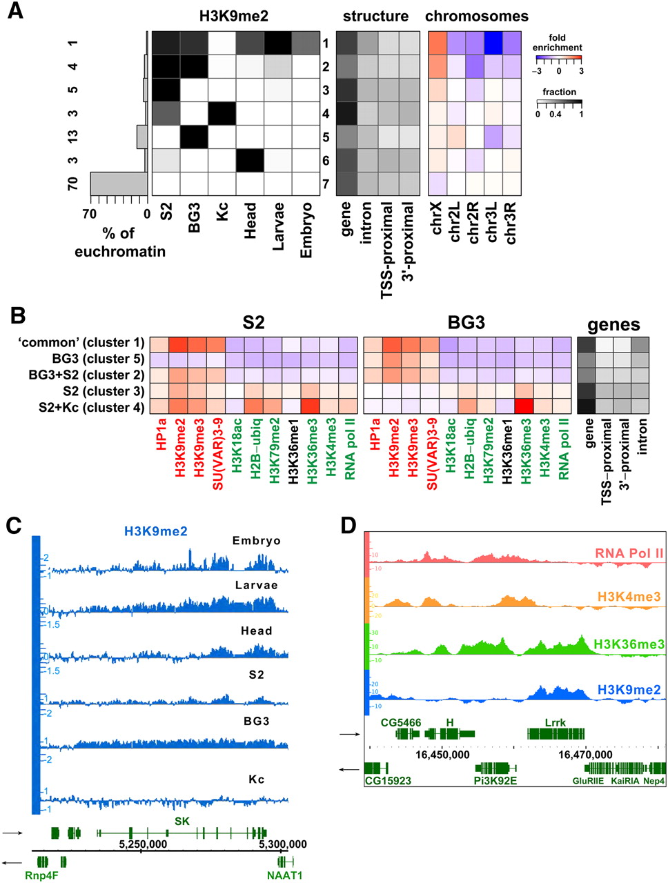 BG3 and S2 cells show novel domains of H3K9me2 enrichment within euchromatic regions. (A) Regions of H3K9me2 enrichment across different cell types. The euchromatic portion of the genome (excluding regions defined as heterochromatin by the border analysis; see Fig. 3A) was subdivided into sets of regions that exhibit a common pattern of H3K9me2 enrichment across different cell types. Each box shows the fraction (grayscale) of the regions belonging to the set (row) that are enriched for H3K9me2 in a particular cell type (column). The histogram on the left shows the fraction of the euchromatic genome in each row (1–7), with exact %s to the left. Regions in row 7 lack H3K9me2 across all examined cell types, whereas row 1 groups regions enriched for H3K9me2 in all examined cell types (except for Kc cells). Rows 2–6 identify other euchromatic regions that display H3K9me2 enrichment in only a subset of cell types (e.g., only BG3 cells (row 5) or S2 cells (row 3), or both (row 2). Panel 2 shows the fraction of sequence within each group associated with different parts of annotated genes (gene, entire gene; TSS-prox. [±500 bp of the TSS annotated in Flybase], 3'-prox. [±500 bp of the 3'end annotated in Flybase], and intron are a subset of the sequences included in the “gene” column). The third panel shows over-/under-representation of each cluster on different chromosome arms, which was calculated by comparing the fraction of sequence of a cluster on a specific chromosome with the fraction of sequence the chromosome contributed to the array. (B) Average enrichment of chromatin marks in the cell-type-specific H3K9me2 enrichment domains. Each row shows average enrichment levels (log2 scale) within regions corresponding to the main patterns seen in A. The specific regions were identified using HMM segmentation (see Methods). Panel 1 shows the average enrichment patterns in S2 cells, panel 2 shows the average enrichment patterns for the same genomic regions in BG3 cells, and panel 3 indicates the fraction of the particular H3K9me2 enrichment domain associated with gene features. While “common,” BG3 and BG3+S2 domains (rows 1–3) are enriched only for heterochromatic marks, the S2-specific and S2+Kc-specific domains (rows 4,5) include actively transcribed genes that in S2 cells are enriched for heterochromatic marks along with marks normally associated with transcription, similar to “mixed” state genes found in heterochromatin (Fig. 4). (C) Browser shot showing an example of a gene from a “common” (row 1) domain, located in the euchromatic arm of chromosome X, and enriched for H3K9me2 across all examined cell types except Kc cells. x-axis, chromosomal position in base pairs (centromere to the left). Genes are indicated in green with their orientations as indicated by the arrows. y-axis, H3K9me2 enrichment levels (log2 scale) for the indicated tissue. (D) A representative region of arm 3R containing an S2-specific domain (row 3), showing a combination of H3K9me2 (blue) and marks associated with active transcription—H3K36me3 (green), H3K4me3 (orange), and Pol II (red). Two sets of genes display a divergent promoter orientation typical of the S2-unique domain genes. X-axis, chromosomal position in base pairs; y-axis, enrichment levels (log2 scale).