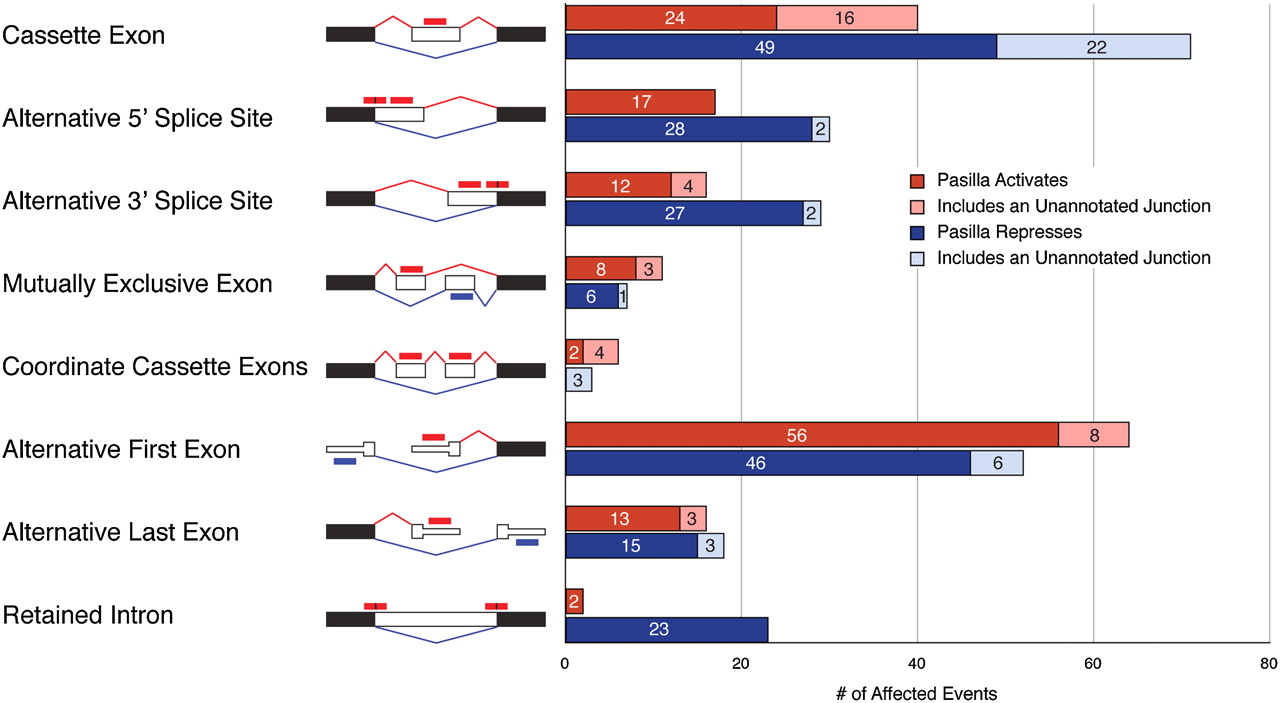 405 PS-regulated pre-mRNA processing events. (Black boxes) Constitutive regions; (white boxes) alternative regions. (Red lines) Splice junctions for the inclusion isoform; (blue lines) junctions for the exclusion isoform. (Red bars) Exonic reads that support the inclusion isoforms; (blue bars) exonic reads that support the exclusion isoforms; (red bars with a black line) reads that support the inclusion isoform, but have a shared portion with the exclusion isoform. Thinner portions of the boxes in alternative first exons and alternative last exons correspond to UTRs.