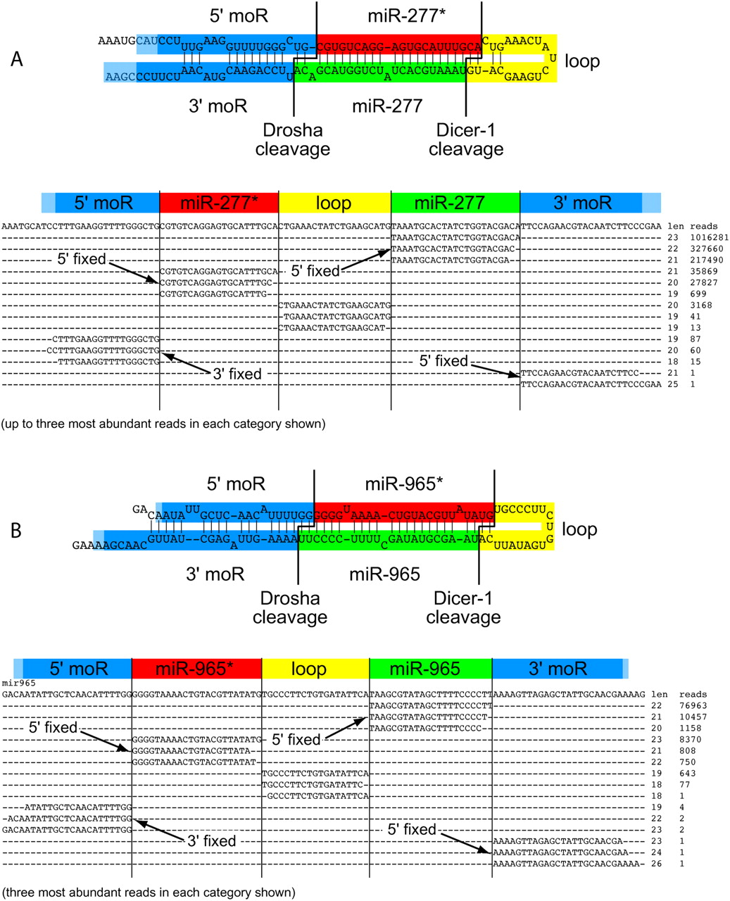 Examples of miRNA loci exhibiting five phased species. (A) mir-277; (B) mir-965. The most abundant product is the miRNA (green) followed by its partner miRNA* species (red). The 5′ and 3′ ends of these RNAs dovetail with the abundant loop reads (yellow), as well as 5′ miRNA overlap (moR) and 3′ moR reads (blue). The convention of highlighting mature species green and star species red is continued in all subsequent figures.