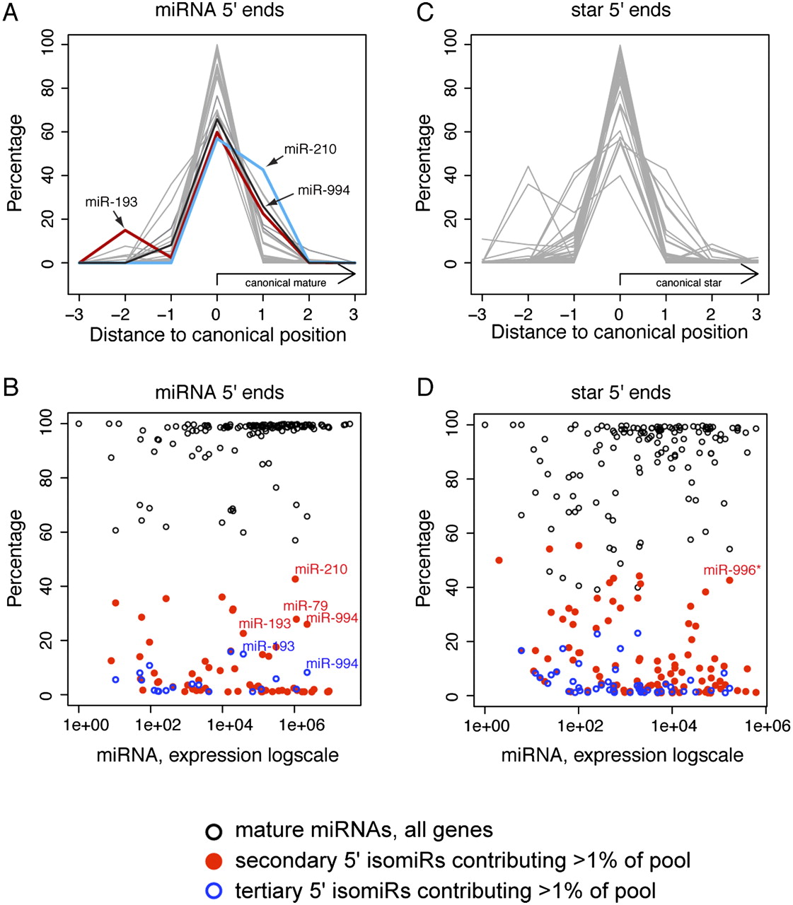 5′ variability of Drosophila canonical miRNAs. These charts summarize data for 135 canonical miRNAs that generated more than 1000 reads and had exclusively unique genomic mappings. (A,B) The 5′ end precision of mature miRNA species was generally high for well-expressed species; however, select loci generated abundant secondary and/or tertiary 5′ isomiRs. (C,D) The 5′ end precision of miRNA* (star) species was less than for mature miRNAs; still, only a relatively select group of highly expressed star species exhibited abundant 5′ isomiRs. The full analysis is available in Supplemental Table S4.