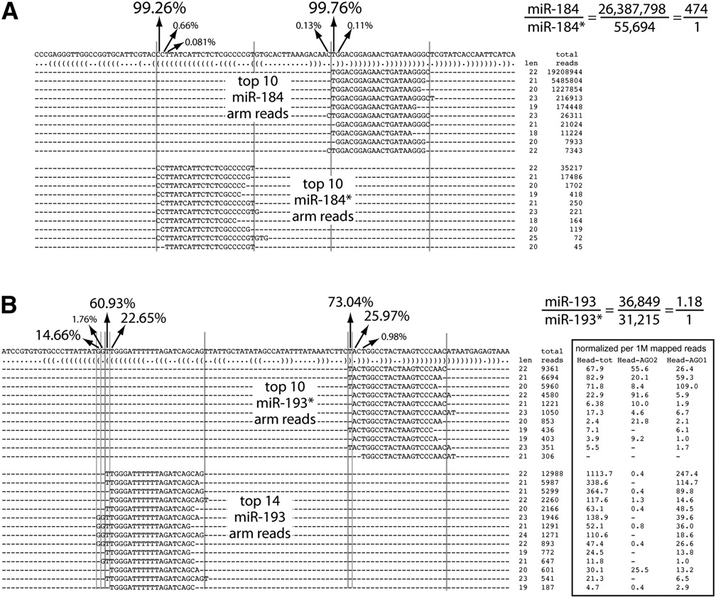 Exemplary loci illustrating precision and variability in miRNA processing. (A) Most miRNAs, such as mir-184, exhibit precisely defined 5′ ends of both miRNA and star species. Since the mature strand of mir-184 is highly biased over its star species, there is one dominant miRNA-type regulatory species produced from this locus. (B) mir-193 is a locus exhibiting balanced accumulation of small RNAs from its hairpin arms. In addition, both 5p and 3p arms exhibit abundant secondary and even tertiary 5′ isomiR species. All of these accumulate in AGO1; therefore, mir-193 produces at least five substantial miRNA-type regulatory RNAs. Note that the 3p RNAs also accumulate in AGO2 as evidenced by their enrichment in a library prepared from small RNAs resistant to oxidization.