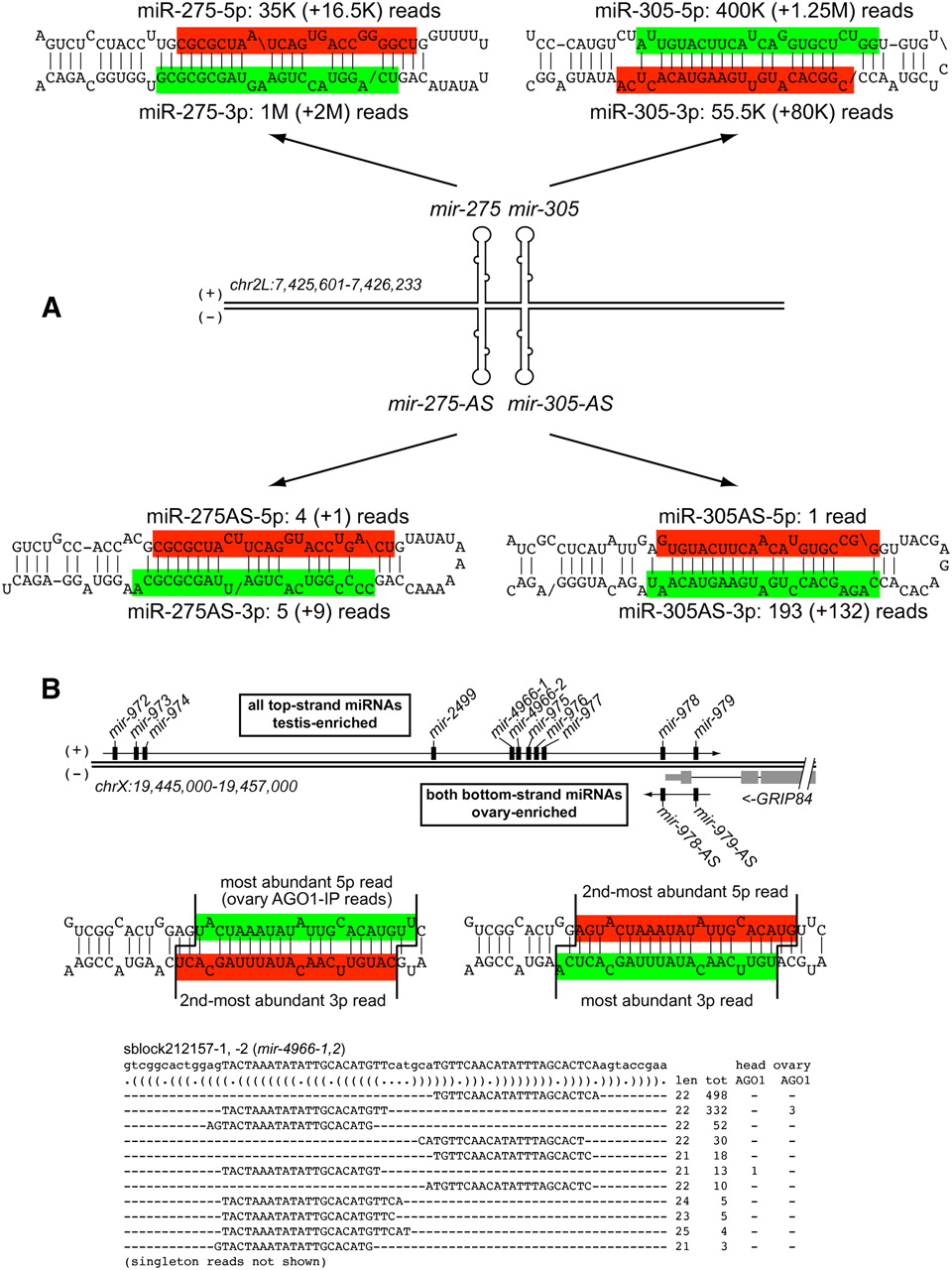 Examples of antisense transcription and processing across miRNA operons. (A) The top genomic strand of the mir-275/mir-305 locus is abundantly converted into mature miRNAs, but the bottom genomic strand also exhibits confident evidence for miRNA production across both miRNA hairpins. Primary numbers indicate reads matching precisely to the highlighted species; numbers in parentheses sum all other isomiRs matching that hairpin arm. (B) The distal end of the mir-972-979 cluster on the X chromosome overlaps Grip84, transcribed on the other strand. We detected confident miRNA production from the antisense strands of mir-979 and mir-978. This locus also bears a perfect tandem hairpin (sblock212157/mir-4966) that is subject to alternate Drosha and Dicer-1 cleavage to produce multiple 5′ isomiRs on both hairpin arms; multiple species were also detected in AGO1-IP libraries. The entire hairpin is duplicated; thus, all reads could map to either location.