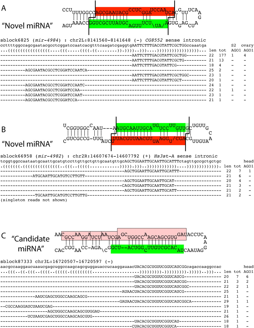Examples of novel miRNAs annotated in this study. (A) sblock6825/mir-4984 and (B) sblock66958/mir-4982 are novel miRNA loci that generate specific miRNA/miRNA* duplex species and had at least some reads in AGO1-IP libraries. mir-4982 approaches the lower limit for read accumulation needed for confident annotation. (C) sblock87333 is an example of a “candidate” miRNA locus that was not assigned a miRNA gene name at present. It exhibits heterogeneous 5p arm species (pink), and its dominant 3p arm is 20 nt in length, which is not typical for known miRNAs. Nevertheless, the 3p species clearly exhibit a preferred 5′ end, and several versions of the 3p species extending to 22 nt were present in head AGO1-IP data (GSM488489); one of the 5p reads would potentially pair with this duplex in an appropriate fashion. Therefore, this locus may eventually prove to be a genuine miRNA locus.