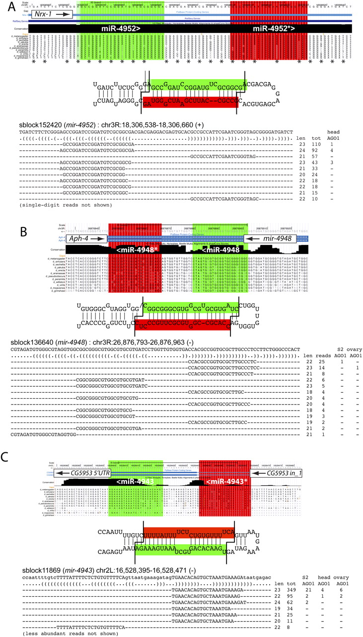 Examples of novel miRNAs generated from mRNAs. (A) A miRNA from the sense strand of the Nrx-1 coding region. This locus generates a specific miRNA/miRNA* duplex and exhibits some reads from head AGO1-IP data. Inspection of 12 species alignments indicates that the hairpin sequence evolves readily by codon wobbles, at a rate similar to the flanking nonhairpin codons. (B) A miRNA from the antisense strand of the Aph-4 coding region. In addition to specific miRNA/miRNA* duplex reads, this locus also generated a phased 5′ moR. (C) miRNA production from a primary-mRNA transcript in which the hairpin is produced from the pairing of intronic and exonic sequence of CG5953.