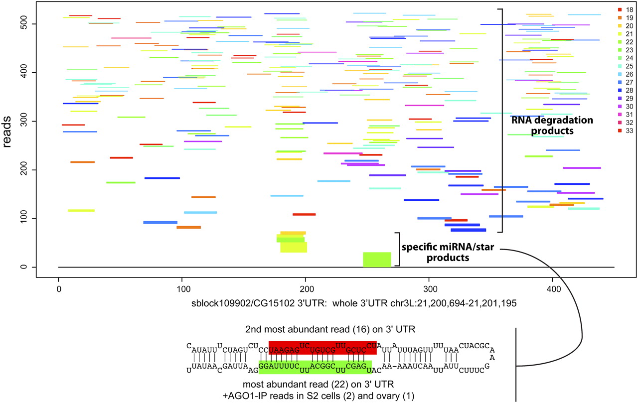 Example of a transitional miRNA locus, which exhibits signatures of both RNA degradation as well as Drosha/Dicer-1 processing across its precursor. Each read length has been plotted in a distinct color to emphasize the heterogeneity of cloned species mapping to the 3′ UTR of CG15102. The reads have been ordered on the y-axis with the most abundant individual species at the bottom. It can clearly be seen that a specific set of 21–22 nt reads are specifically made. These map to a typical pri-miRNA hairpin with a lower stem and a miRNA/miRNA* duplex region.